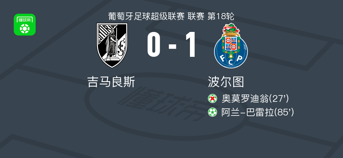 北京时间1月19日葡萄牙足球超级联赛 联赛 第18轮,吉马良斯主场对阵波尔图。波尔图阿兰-巴雷拉破门。最终比分吉马良斯 0–1 波尔图。