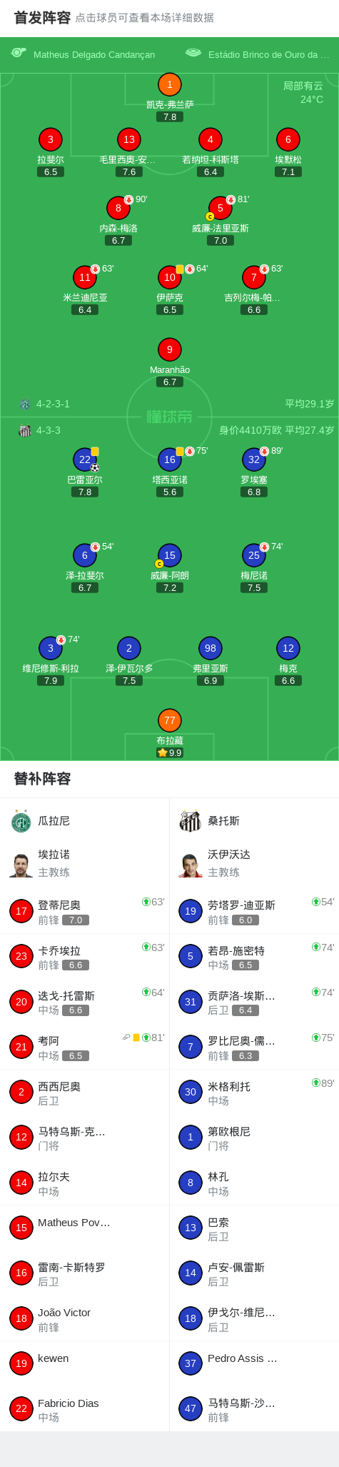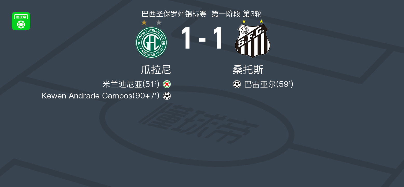 北京时间1月19日巴西圣保罗州锦标赛 第一阶段 第3轮,瓜拉尼对阵桑托斯。瓜拉尼Kewen Andrade Campos破门。桑托斯巴雷亚尔破门。最终比分瓜拉尼 1–1 桑托斯。