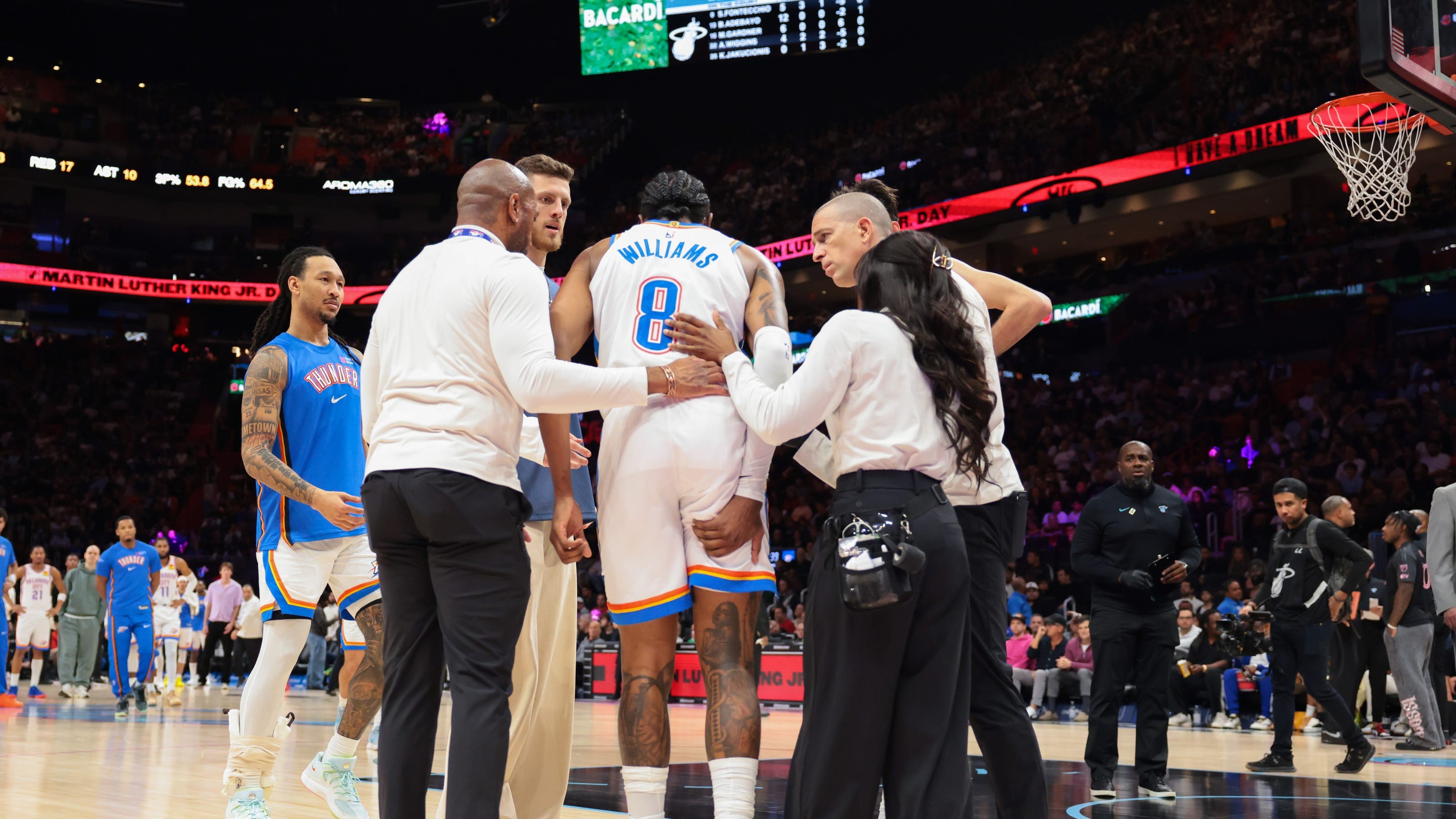 杰伦-威廉姆斯是在1月18日雷霆不敌热火的比赛中受伤,那场比赛他提前退出了比赛。