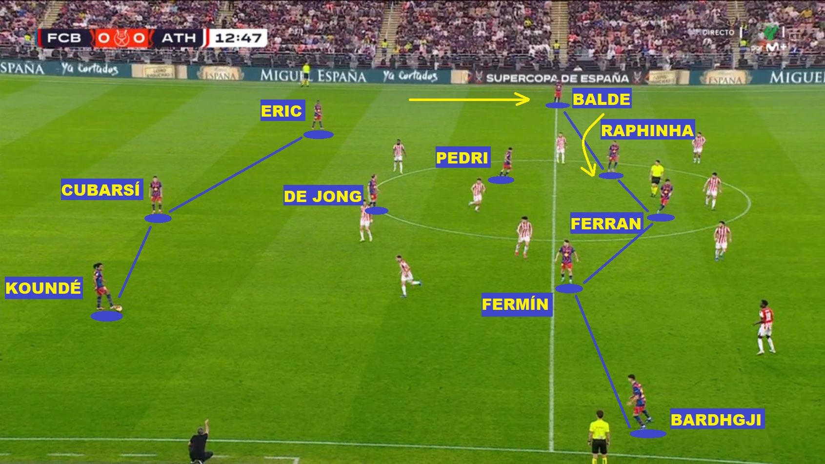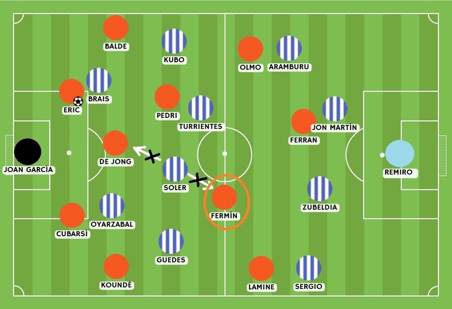 在比赛伊始,皇社很难适应这种压迫节奏,这也要归功于巴萨精准的跑位。弗利克在有球状态下构建了一个中场体系,让德容回撤到离中卫很近的位置接球,这让卡洛斯·索莱尔陷入了是否要前压盯防这位荷兰人的犹豫之中。而在前方,佩德里和费尔明占据了中前卫的位置,牵制了卡洛斯·索莱尔和图连特斯的站位。索莱尔整场都面临两难抉择:是扑出去抢德容,还是留在中路盯防费尔明——因为苏贝尔迪亚并没有完全对上费尔明的点。