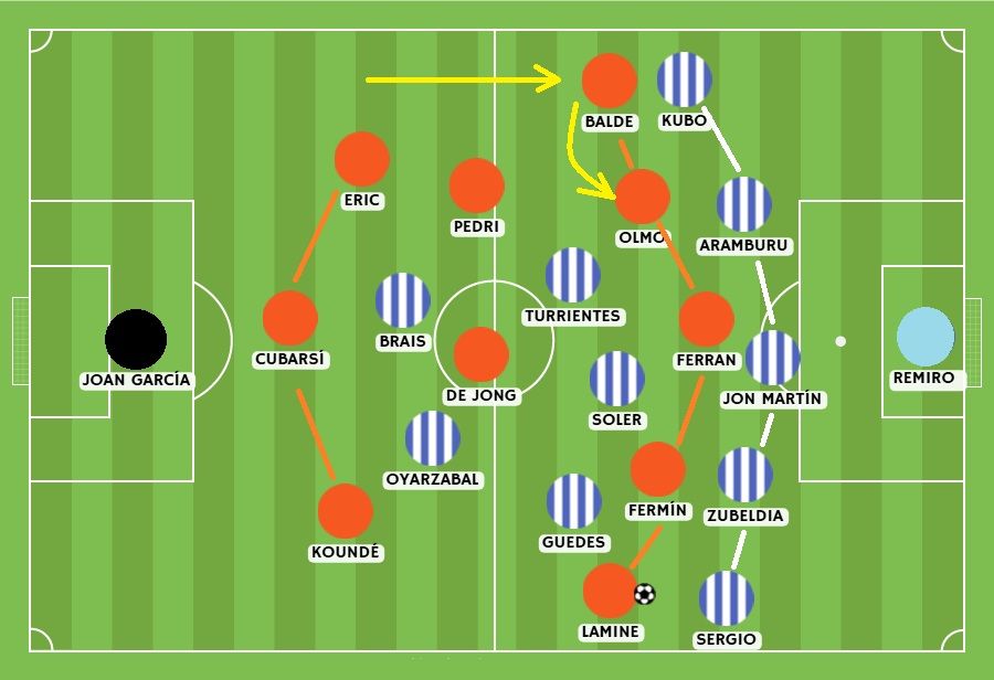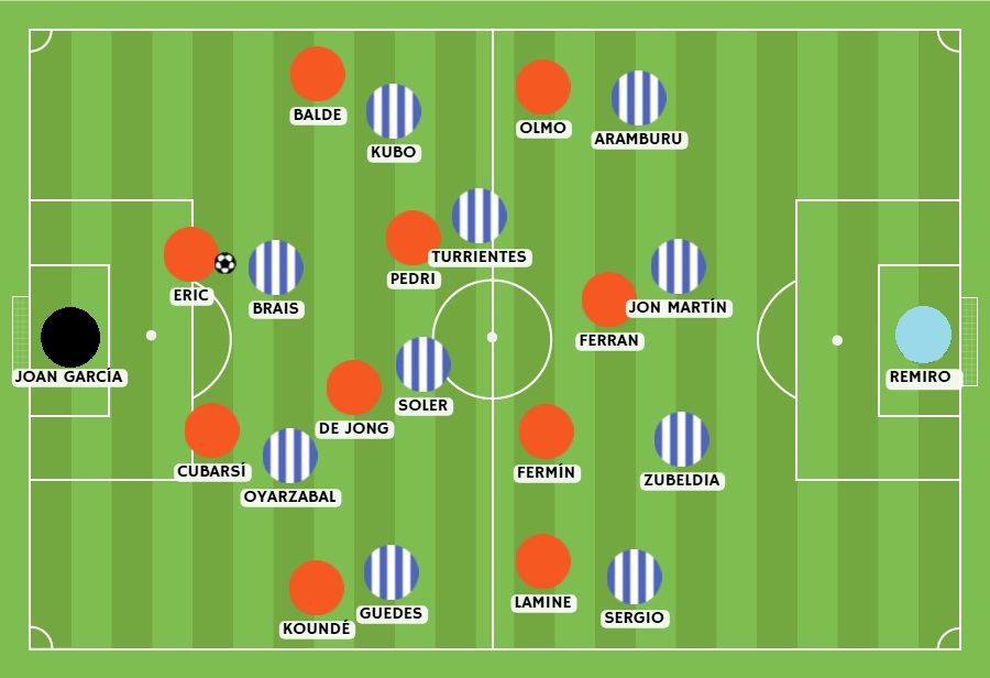 整场比赛,皇社几乎从未摆脱巴萨的压制。如果有的话,也仅仅是在将比分改写为 2-1 后的短短几分钟内。但也必须承认,在上半场中段,皇社至少成功调整了他们的高位防守。这并非马塔拉佐进行了什么复杂的战术演练,这种好转更多是源于向所有参与压迫的球员灌输了一个理念:毫无畏惧地追踪各自的盯人对象,从而消除对手任何位置上的优势。卡洛斯·索莱尔开始果断地扑向德容;苏贝尔迪亚也同样对上了费尔明。虽然依然处于劣势环境,但蓝白军团至少看到巴萨不再能轻易地在中路转身并迫使他们向后奔跑。