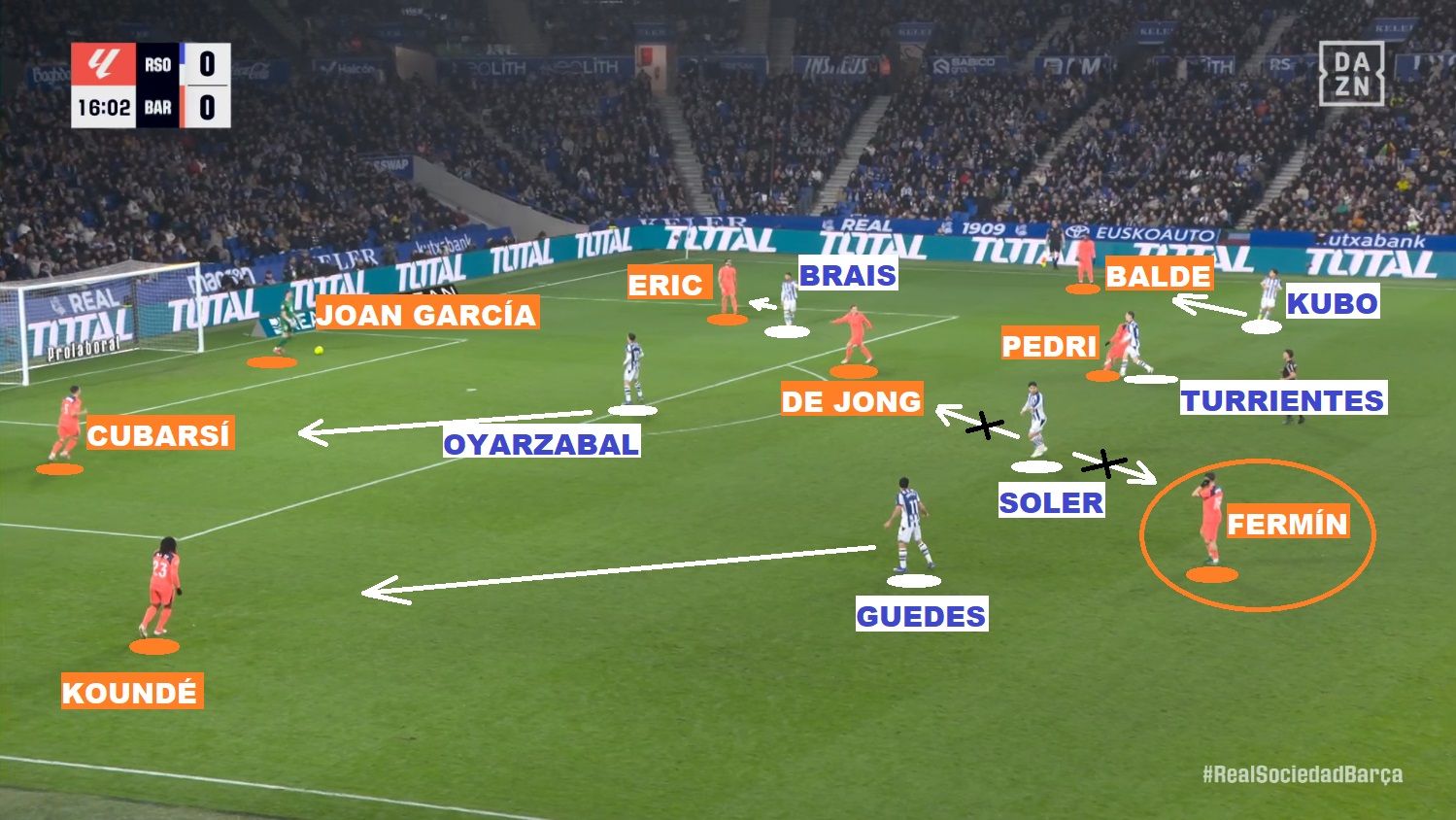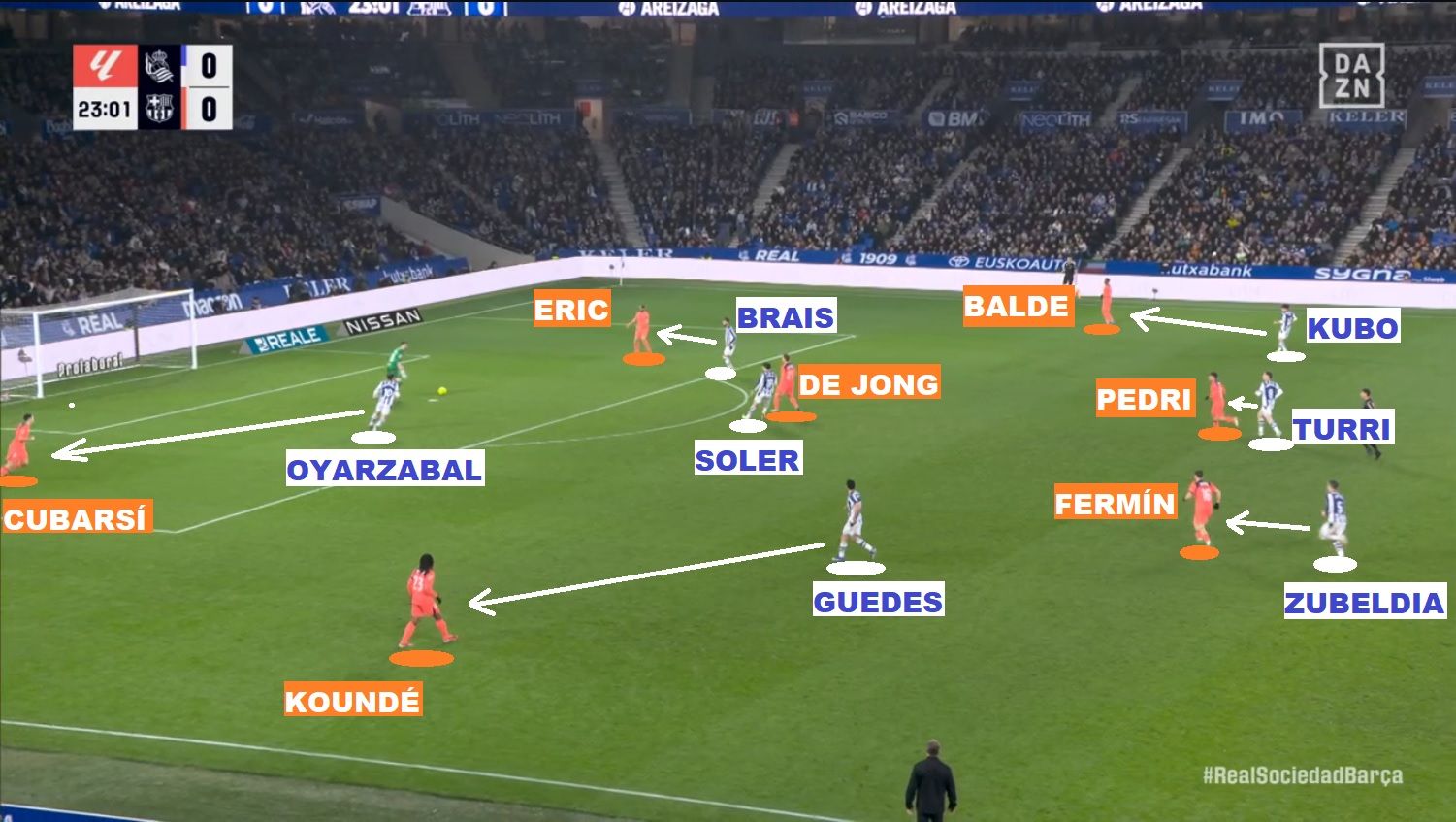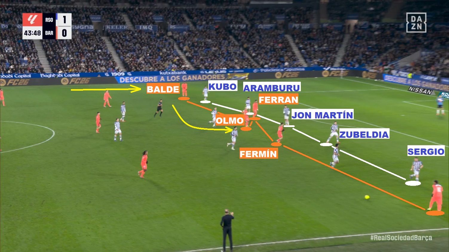 皇社在压迫防守的结构上几乎没有任何改变。当他们决定发起侵略性逼抢时,蓝白军团采用的是 4-4-2 阵型:布赖斯·门德斯顶在第一线(与奥亚萨瓦尔平行站位);而面对巴萨的 4-2-3-1 阵型,苏贝尔迪亚负责修正中场中路理论上的人数劣势(他必须前顶,去对位巴萨的前腰费尔明·洛佩斯)。