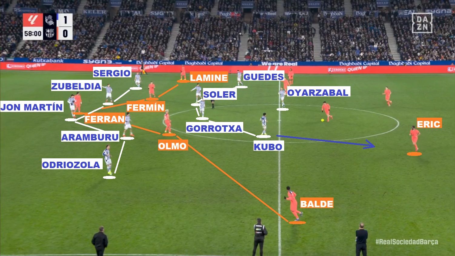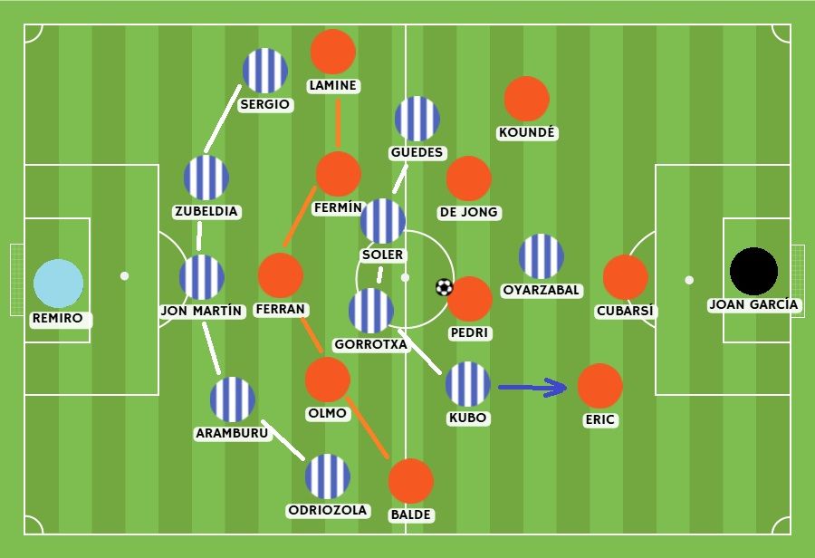 随着时间的推移、比分的领先、巴萨在进攻端的持续施压、部分皇社球员的技术特点以及体能的下降,迫使佩莱格里诺·马塔拉佐必须在比赛进行中动态调整蓝白军团的回防机制。美国人在下半场做出了两个调整动作。首先是换上阿尔瓦罗·奥德里奥索拉,让他接过久保此前承担的防守任务。此外,日本球员在场上的位置前移了几米,在一个新的 5-4-1 阵型中担任边锋,他在这个体系中的防守任务变成了更多地在内线而非外线封堵埃里克·加西亚(在巴萨已展示过的三后卫出球体系中的左中卫)的介入。