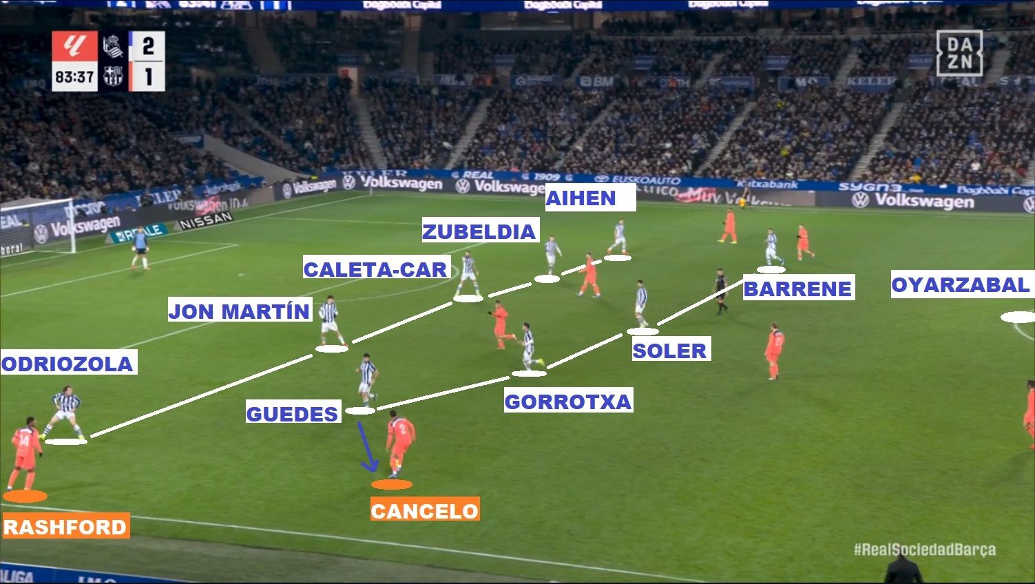 随着恰莱塔-察尔出任中路中卫,马塔拉佐撤下了阿兰布鲁,将永·马丁移至右路,并由三名纯正中卫组成防线,加上奥德里奥索拉和艾恩·穆尼奥斯担任两翼的翼卫。奥德里奥索拉的任务从负责防守对方边后卫(巴尔德或坎塞洛)的前插,变成了在边线附近盯防拉什福德。在前方,前述 5-4-1 阵型中的右边锋在最后几分钟由贡萨洛·格德斯担任,他不再像之前的久保那样去管对方的中卫,而是专注于在边路协助防守弗利克在左翼投入的旨在寻求进球的第二名攻击手。