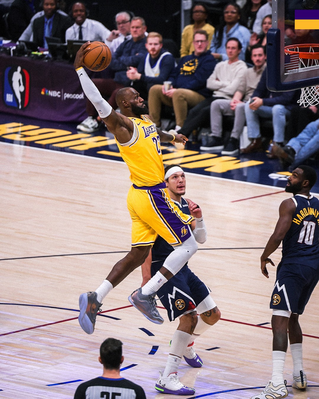 在第三节,詹姆斯6投4中独得9分4板2助帮助湖人一举追回了12分,仅落后2分进入第四节,也间接帮助球队逆转取胜。比赛最后时刻,詹姆斯从外线切入,上演精彩单臂战斧暴扣,技惊四座。
