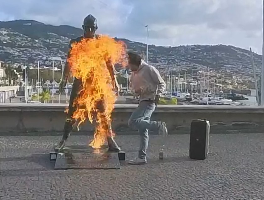 当地时间1月20日,一名男子在社交媒体上发布视频,放火焚烧位于丰沙尔海洋大道CR7博物馆旁的C罗雕像。