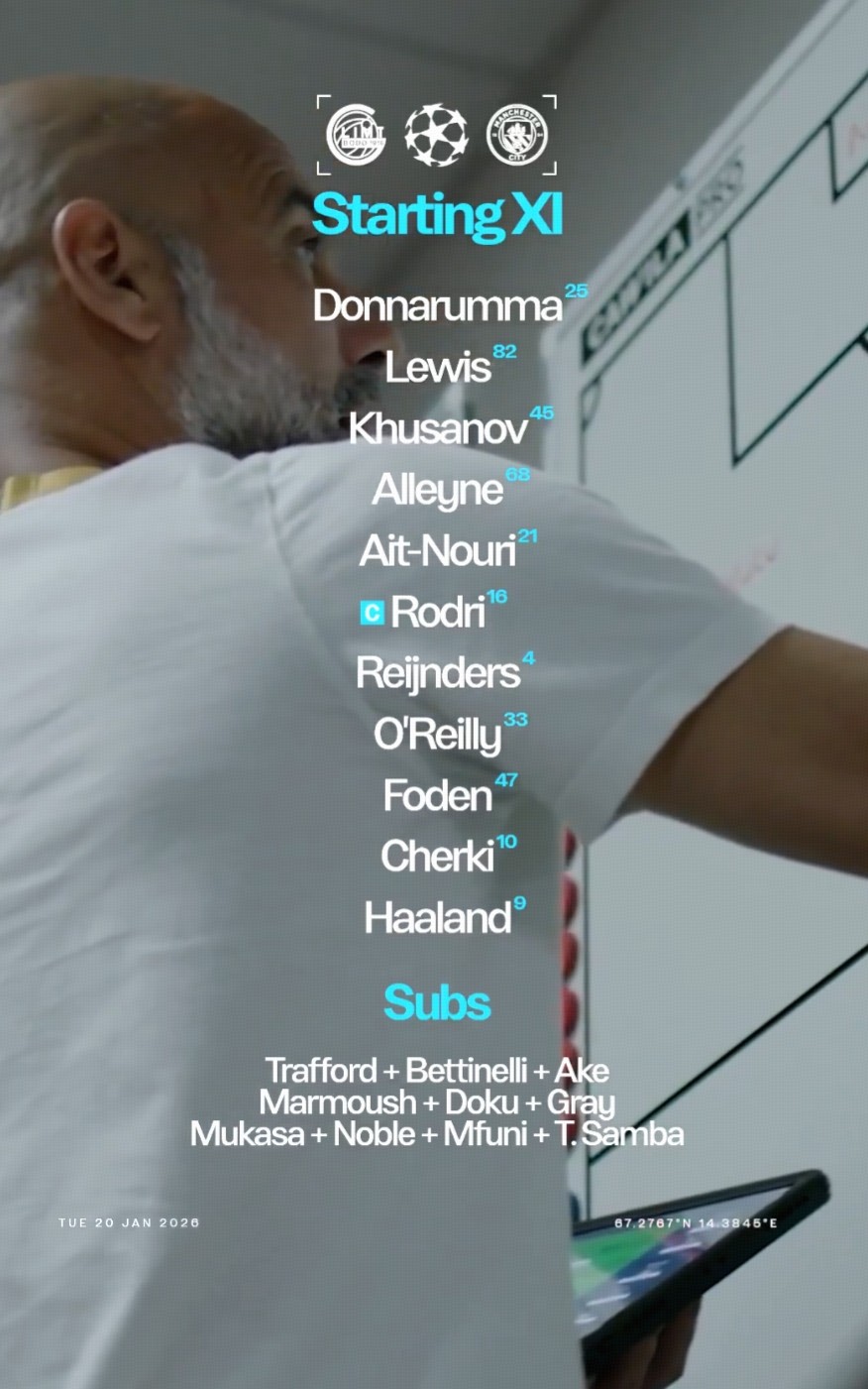 北京时间1月21日1:45,欧冠联赛阶段第7轮,曼城客场对阵博德闪耀。赛前首发公布。