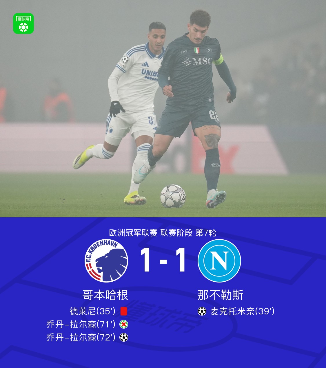 北京时间1月21日欧洲冠军联赛 联赛阶段 第7轮,哥本哈根对阵那不勒斯。哥本哈根乔丹-拉尔森破门。那不勒斯麦克托米奈破门。最终比分哥本哈根 11 那不勒斯。