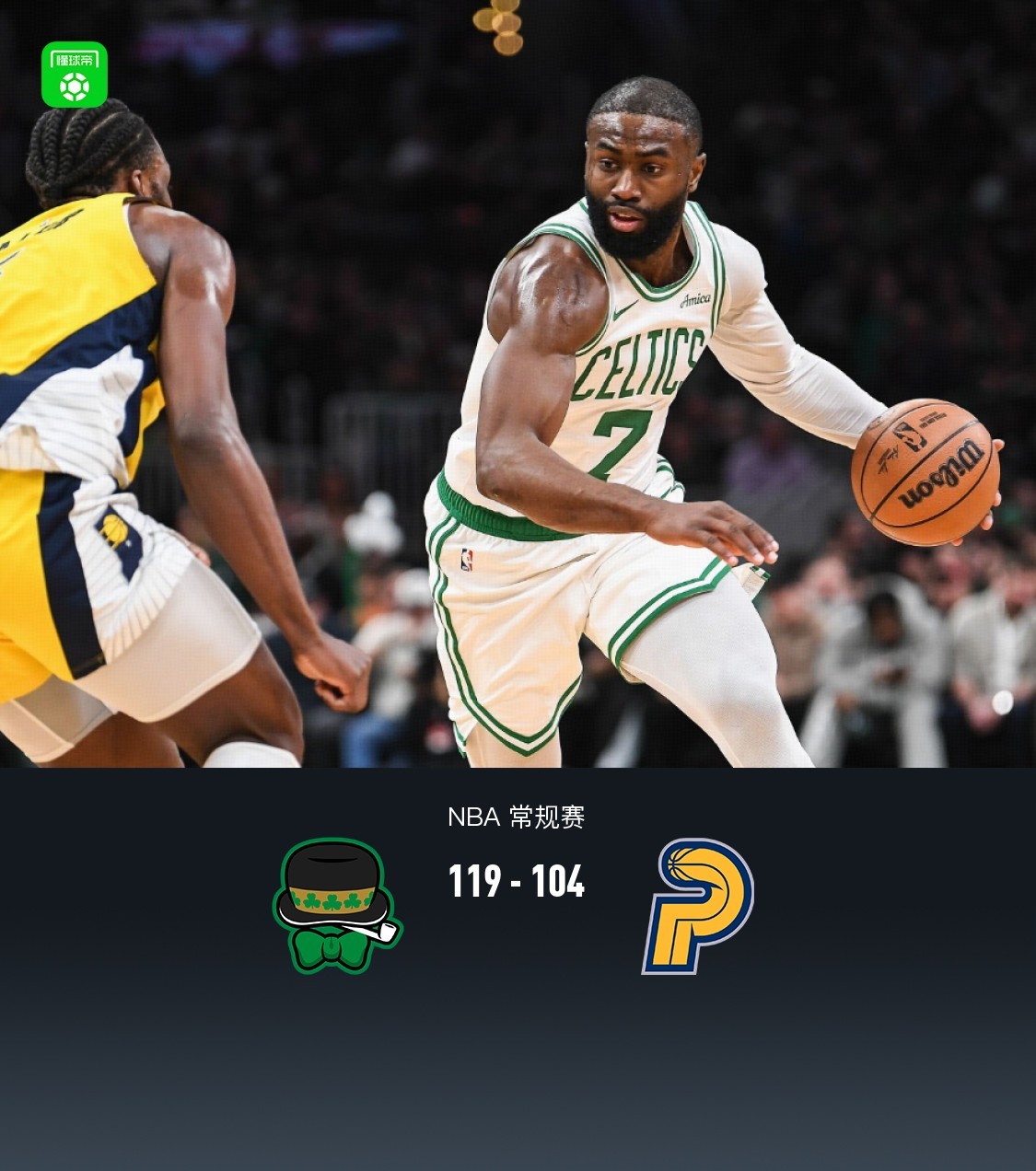 第四节凯尔特人杰伦-布朗拿下7分,步行者贾雷斯-沃克拿下10分,最终凯尔特人119-104战胜步行者