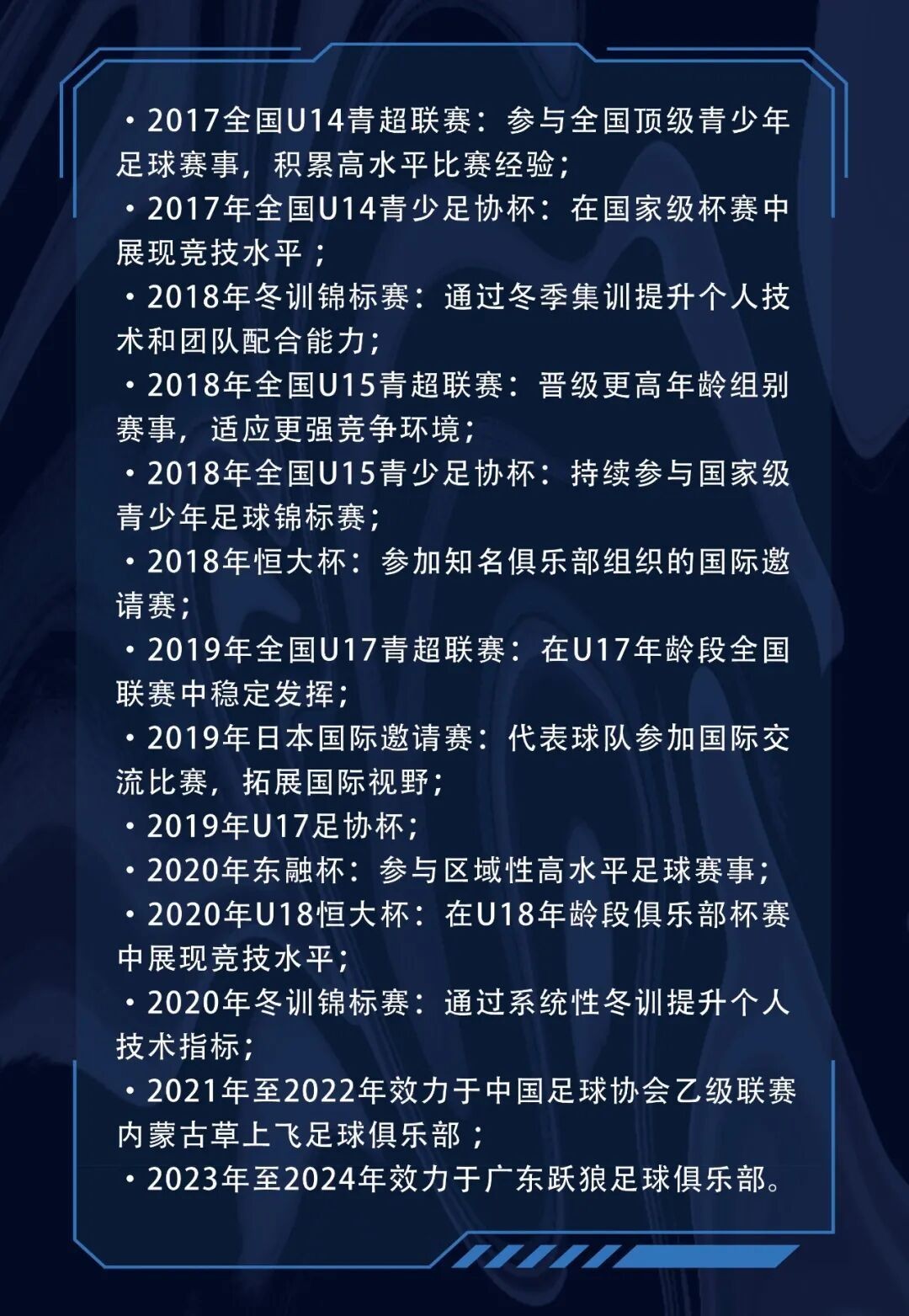 他成长于广州恒大足球学校,接受系统职业训练,基本功扎实,战术理解力强。球员在青少年时期便多次征战全国U系列赛事及国际邀请赛,积累了丰富的比赛经验,具备出色的速度、突破能力与门前意识,能在高强度对抗中稳定发挥,胜任前场多个位置。