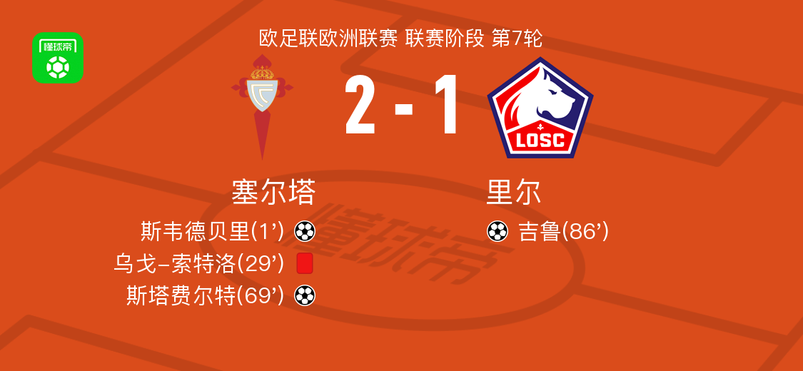 北京时间1月23日欧足联欧洲联赛 联赛阶段 第7轮,塞尔塔对阵里尔。塞尔塔斯韦德贝里破门,斯塔费尔特破门。里尔吉鲁破门。最终比分塞尔塔 2–1 里尔。