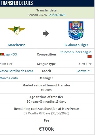 北京时间1月23日,德转更新,葡超莫雷拉人前锋吉列尔梅-谢蒂内加盟天津津门虎,转会费70万欧。