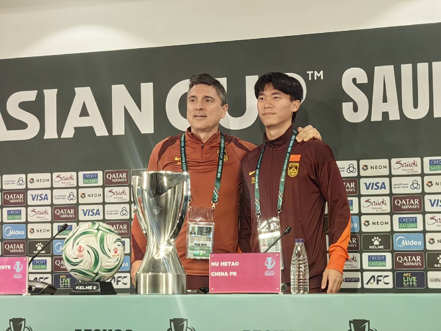 懂球帝记者@雷杰深 现场报道,北京时间1月23日,U23亚洲杯决赛中国vs日本的赛前新闻发布会在吉达阿卜杜拉-费萨尔王子体育场进行。中国队主教练安东尼奥携球员胡荷韬出席。