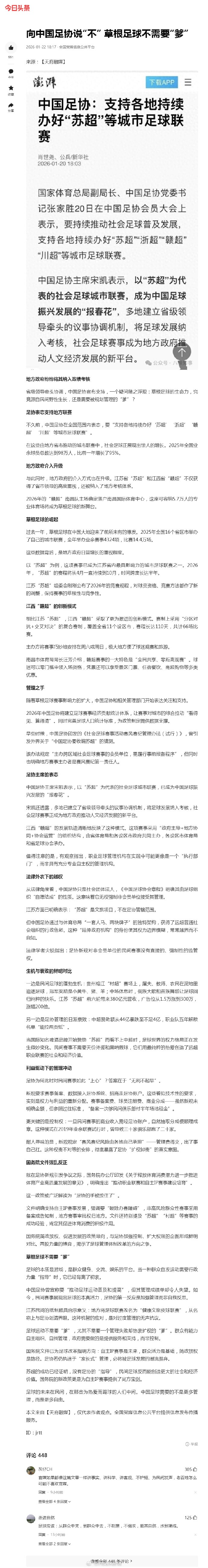 令人震惊。由人民日报社运营的头条账号“全国党媒信息公共平台”今日发布了一则来源为“天府融媒”,题为《向中国足协说“不” 草根足球不需要“爹”》的文章,该文章引用了澎湃网转载的新华社关于足代会的通稿截图,在明知足代会内容的情况下,其文章主旨与全国足球工作会议和足代会精神完全相悖,曲解国家法律和政策,迎合负面流量,炒作“苏超”和中国足协的对立、业余足球与职业足球的对立。其中内容充斥着各种低级错误,多处引用已被官方辟谣的自媒体创作内容,AI味十足。文章署名为jrtt,尽管全国党媒信息公共平台声明“本文来自【天府融媒】,仅代表作者观点。全国党媒信息公共平台提供信息发布传播服务”,但从评论区情况看,被不知情网友普遍认为该文表达了官方立场。