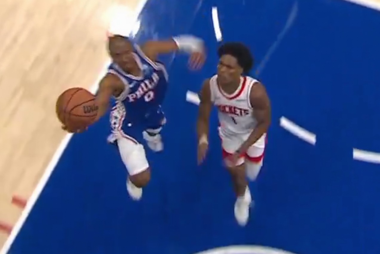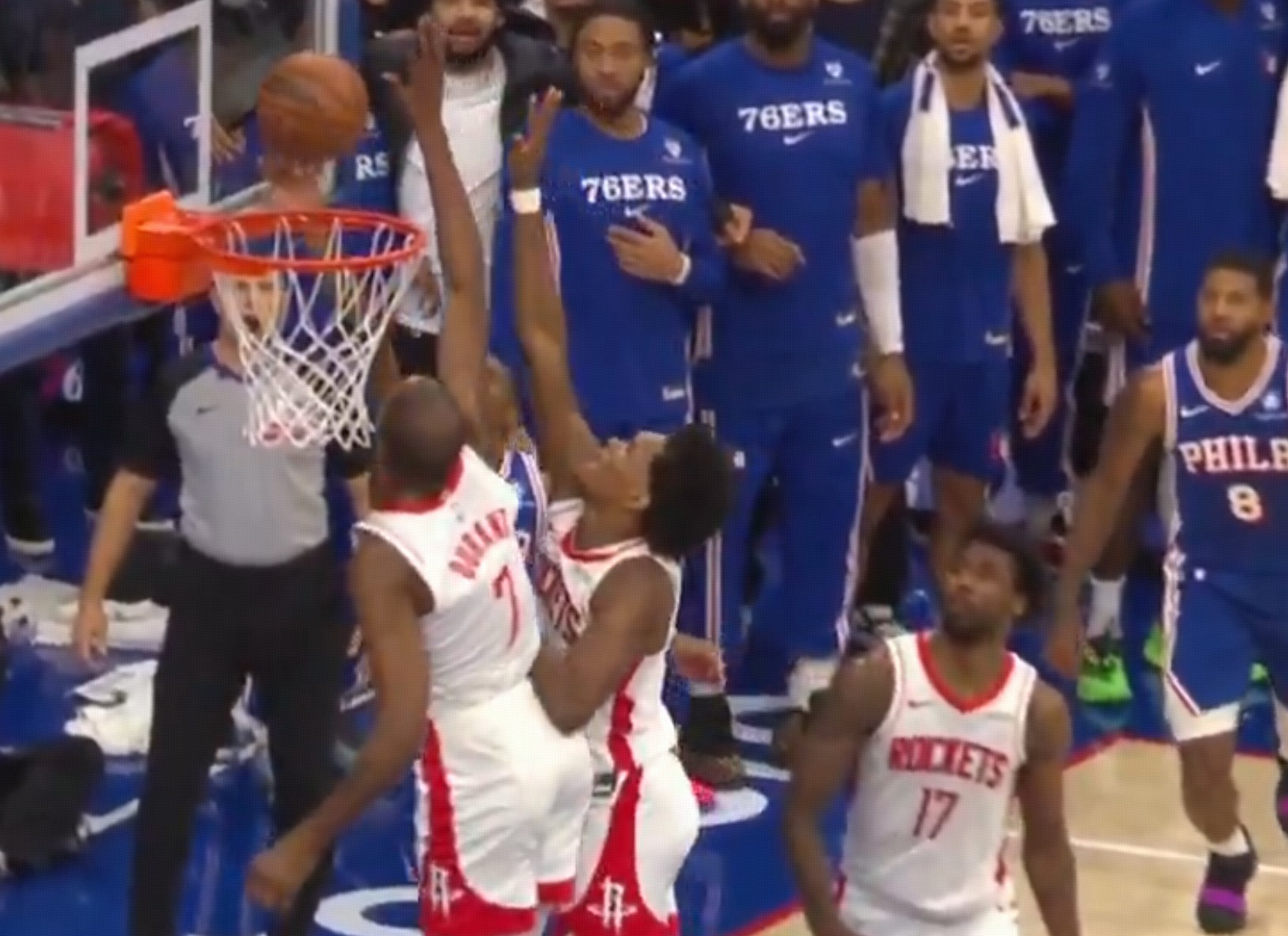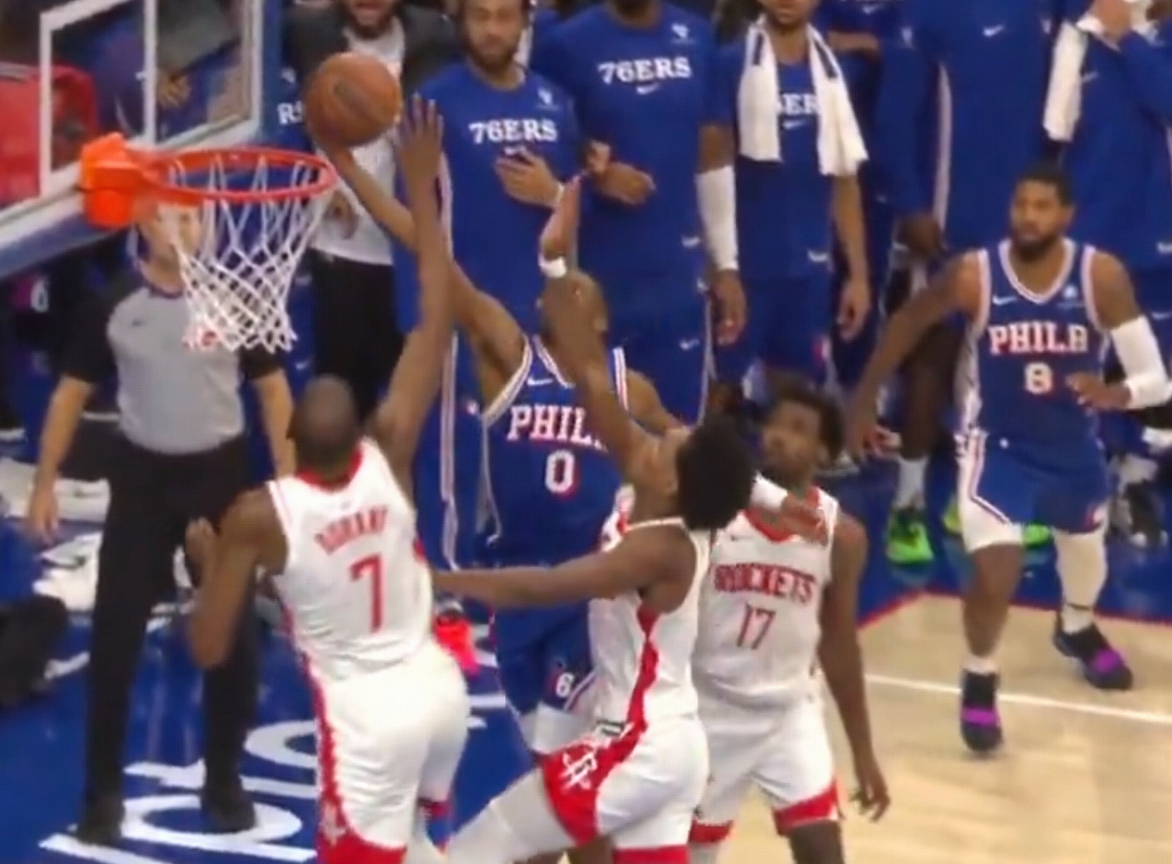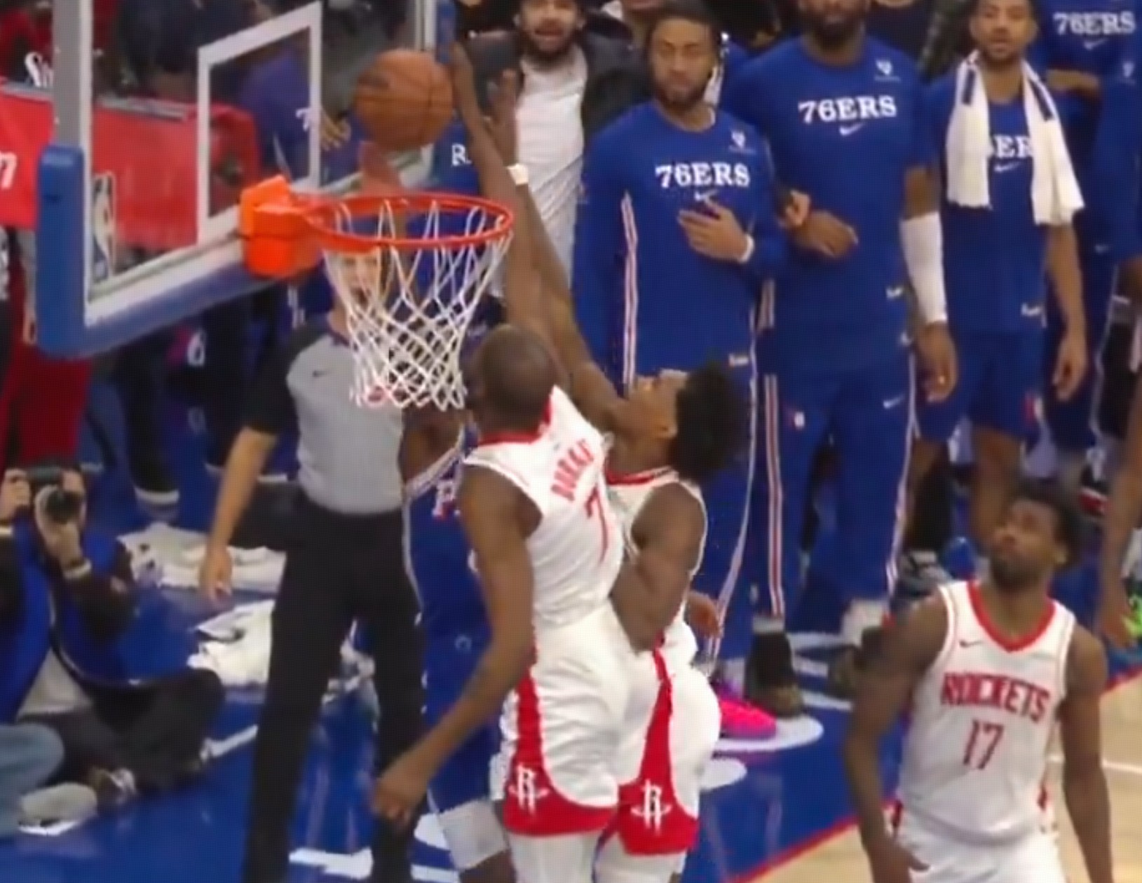 比赛末节最后时刻,双方115-115战平,76人后卫马克西持球突破冲进内线完成上篮,在篮球触碰到篮板后,火箭前锋杜兰特再次触碰篮球,按照规则应该是干扰球违例,但裁判并未吹罚。