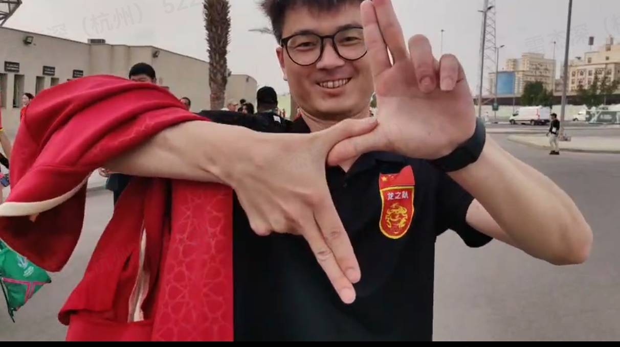 在镜头中,中国球迷大声喊出“中国队加油”,更有球迷比出“以上范下”的经典手势。