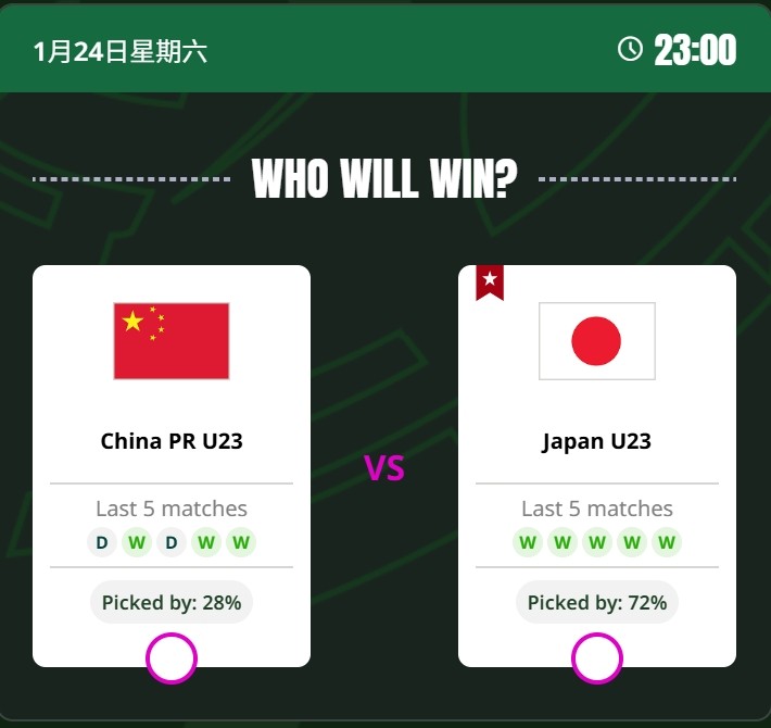 北京时间1月24日23:00,2026年沙特U23亚洲杯决赛即将打响,中国U23男足将与日本U23队争夺冠军。在亚足联官网发布的比赛日赛前预测中,有28%的球迷看好中国队夺冠,余下72%看好日本队。