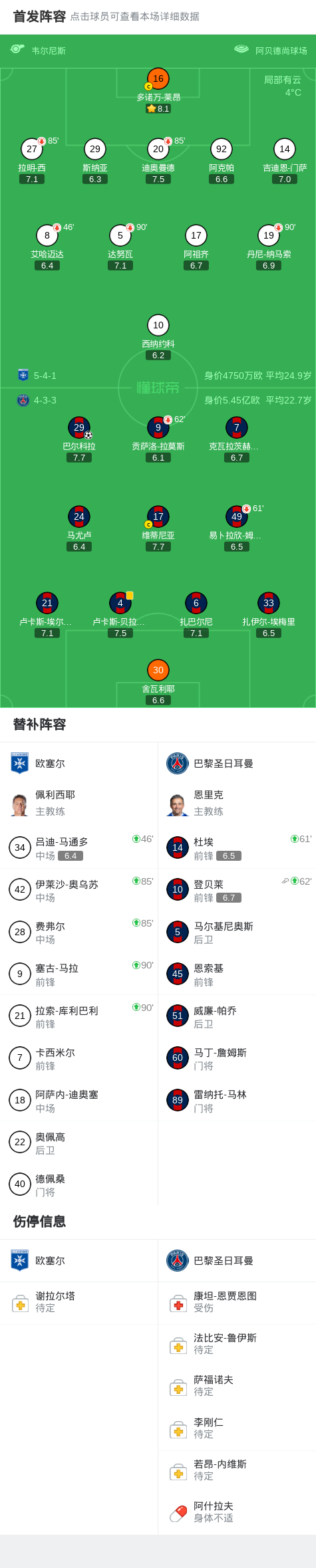 第62分钟,巴黎换人,登贝莱、杜埃替补登场