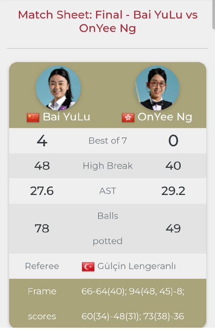 在本赛季前半段已赢得英国锦标赛、尼斯库斯公开赛和爱尔兰公开赛的22岁小将白雨露,本周在保加利亚的这场赛事中未失一局,以统治级的表现赢得了她本赛季的第四个排名赛冠军。