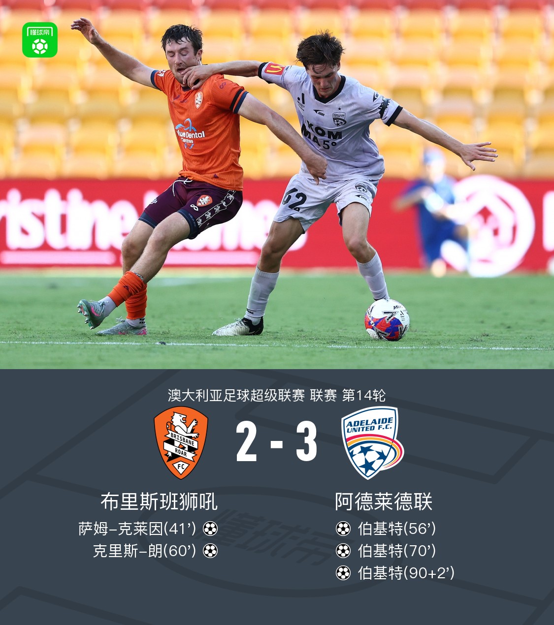 北京时间1月24日,澳大利亚足球超级联赛第14轮,布里斯班狮吼主场对阵阿德莱德联。马耶罗尼送出助攻,萨姆-克莱因破门得分;随后尤尔助攻伯基特扳平比分;鲁斯送出助攻,克里斯-朗再度为布里斯班狮吼取得领先;杜库利助攻伯基特梅开二度;补时阶段,胡安-穆尼斯助攻伯基特完成帽子戏法。最终,布里斯班狮吼2–3不敌阿德莱德联。