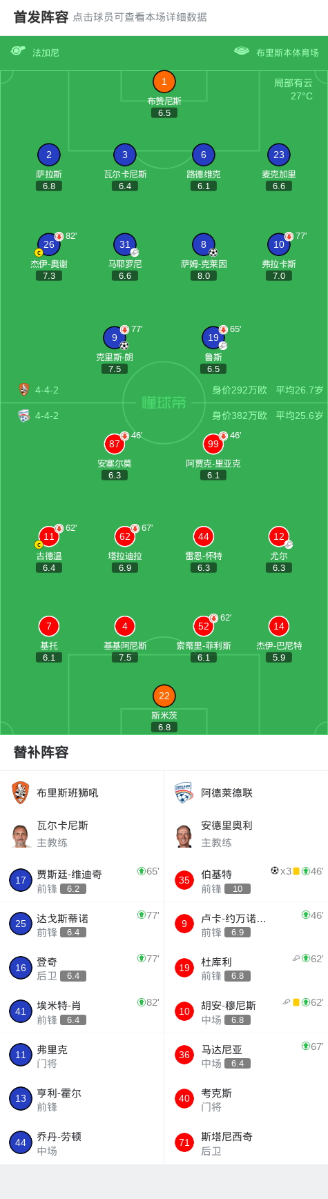 第17 分钟,布里斯-朗禁区内小角度射门,皮球被门将没收