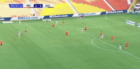 第90+2分钟,穆尼斯传中,伯基特头球破门完成帽子戏法,阿德莱德联3-2