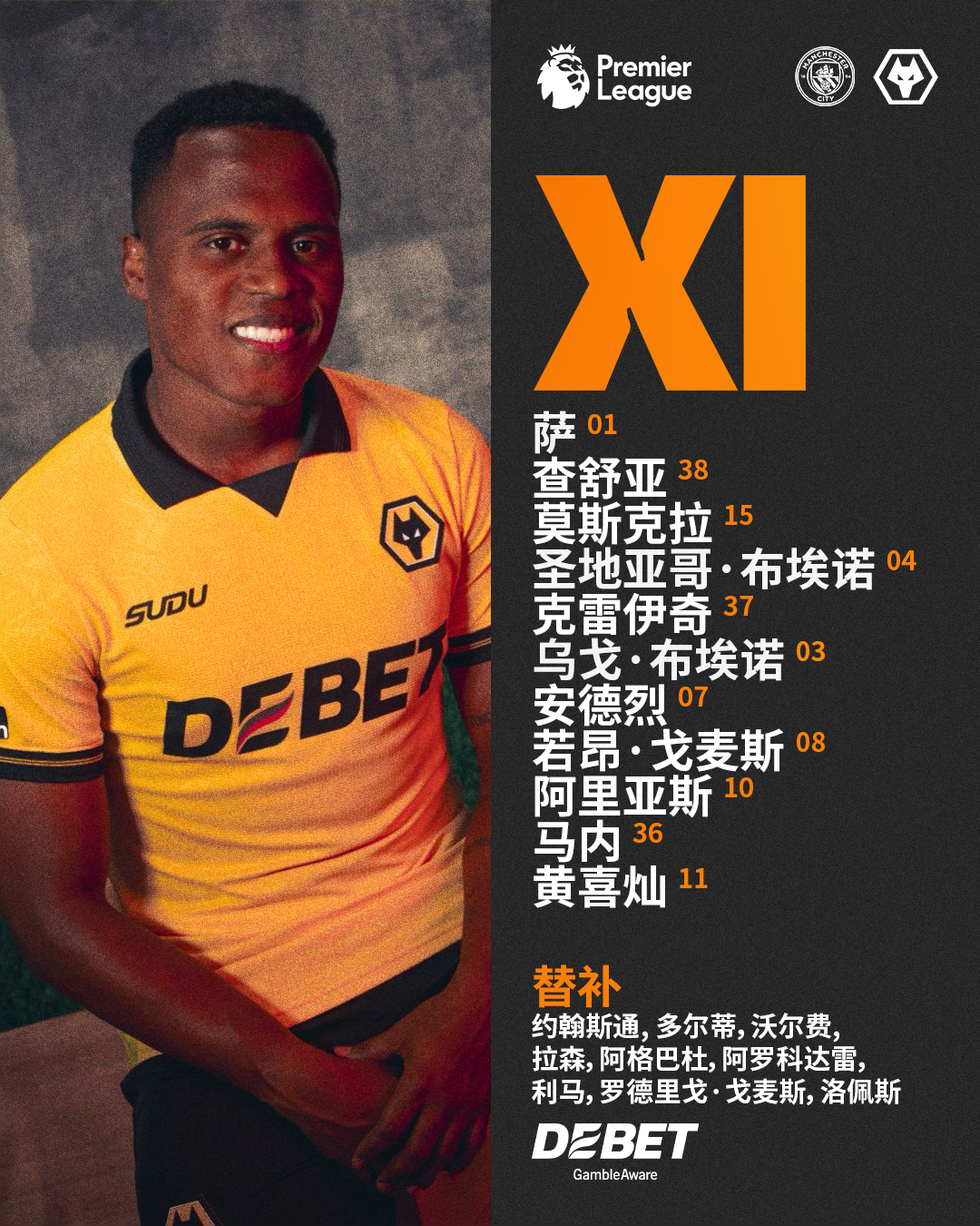 📝曼城vs狼队首发出炉,阿里亚斯重回首发