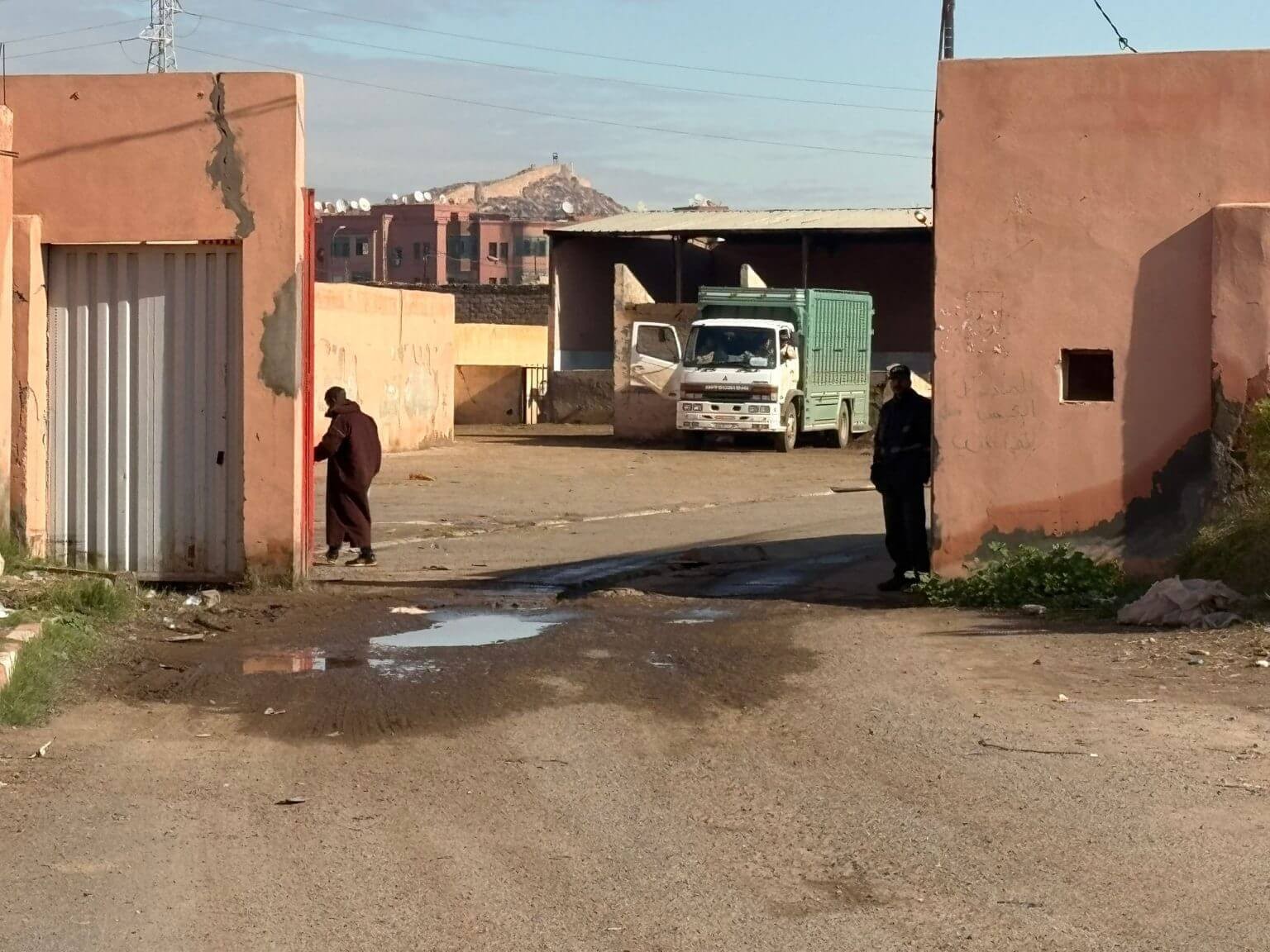 主大门旁边的旗杆上飘扬着摩洛哥国旗,几名穿着厚衣服和牛仔裤的男子懒洋洋地坐在那里抽烟。