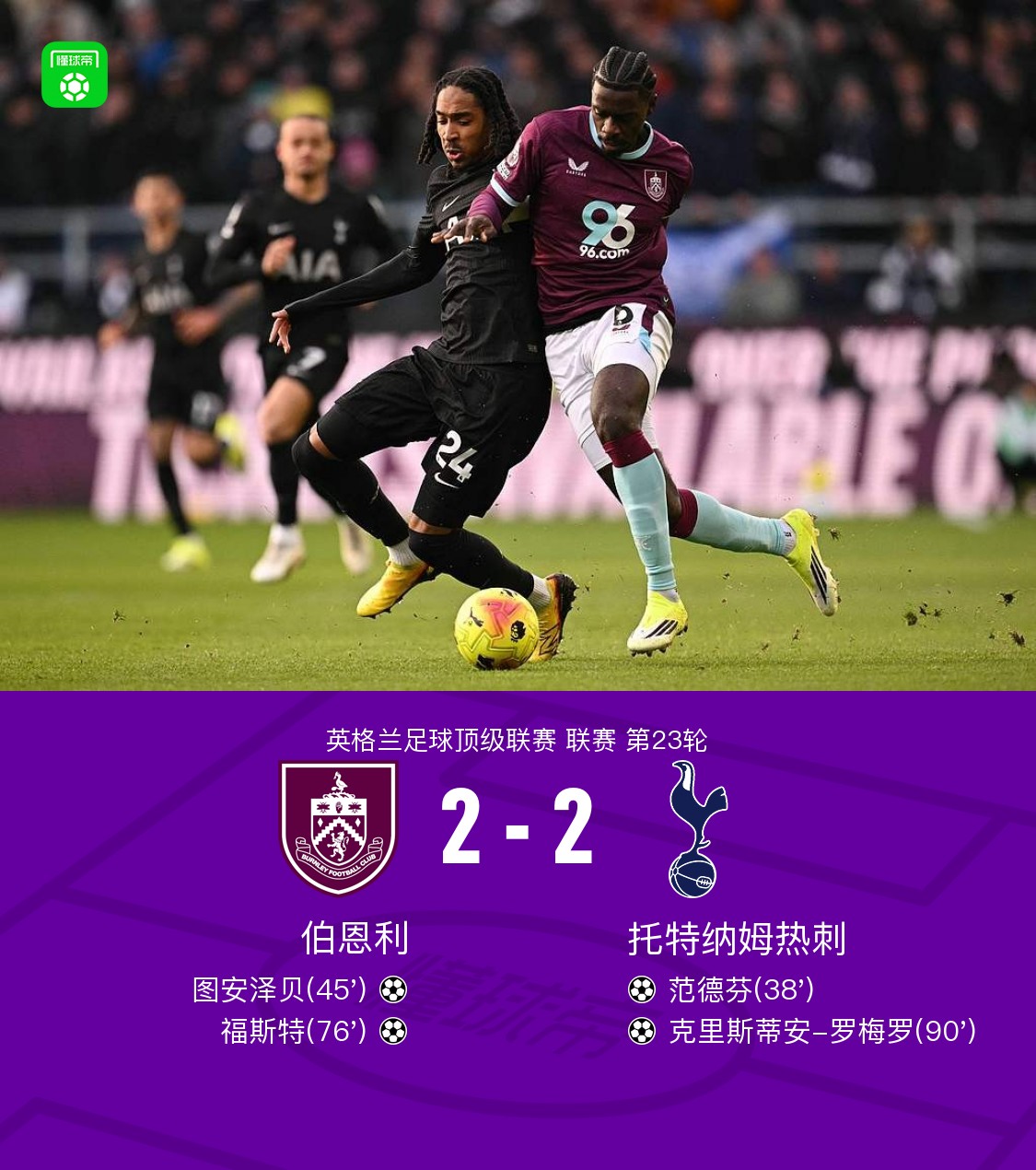 北京时间1月24日,英格兰足球超级联赛第23轮,伯恩利主场对阵托特纳姆热刺。上半场,范德芬打破僵局。沃克传中,图安泽贝扳平比分。下半场,福斯特破门帮助伯恩利反超比分。比赛尾声阶段,罗梅罗冲顶完成绝平。全场比赛结束,热刺2-2战平伯恩利,遭遇英超联赛连续5轮不胜。
