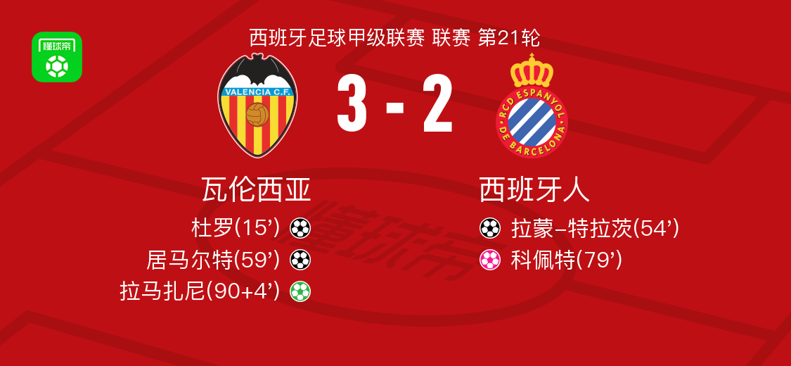 北京时间1月24日,西班牙足球甲级联赛第21轮,瓦伦西亚主场对阵西班牙人。杜罗率先破门,拉蒙-特拉茨随后为西班牙人扳平比分,居马尔特再度助瓦伦西亚取得领先,科佩特不慎自摆乌龙令双方重回均势,补时阶段拉马扎尼主罚点球命中。最终瓦伦西亚3比2战胜西班牙人。