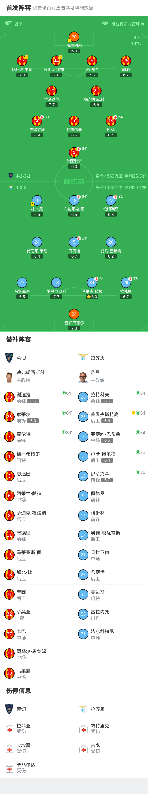 北京时间1月25日意大利足球顶级联赛 联赛 第22轮,莱切主场对阵拉齐奥。最终比分莱切 0–0 拉齐奥。