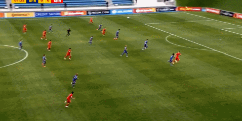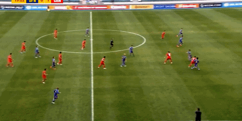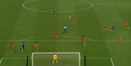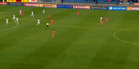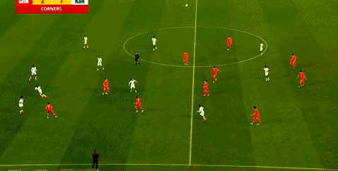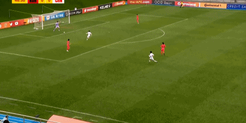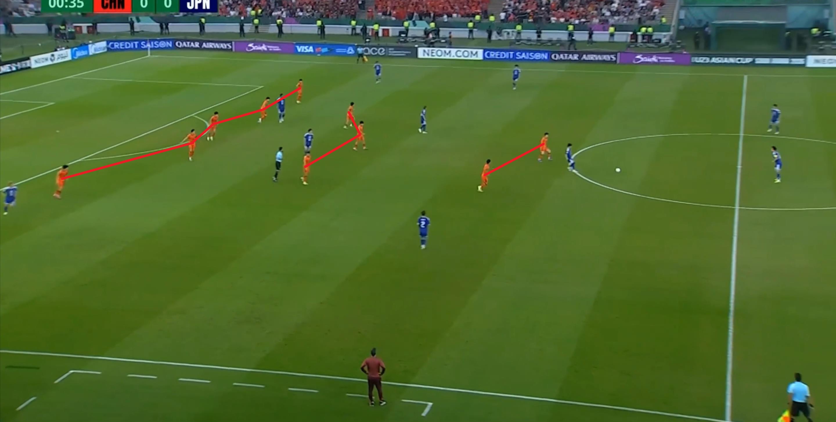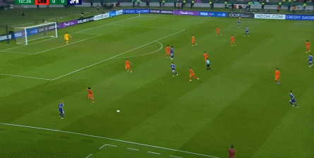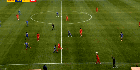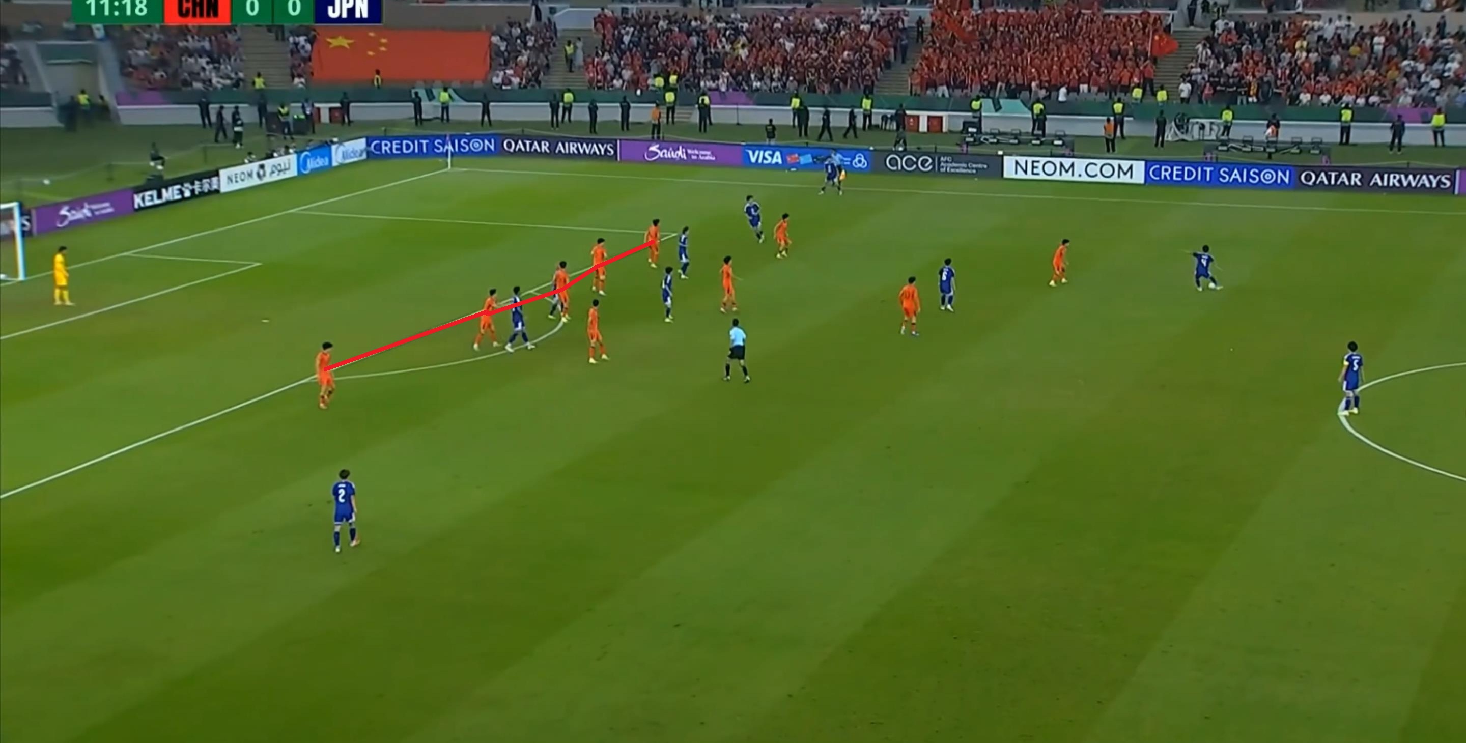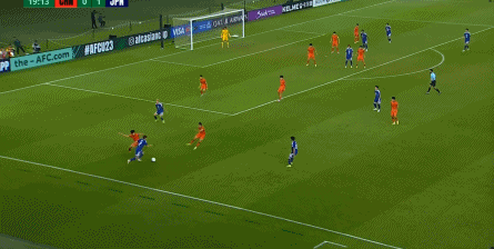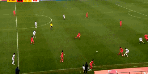 所以在0-2过后,你会看到中国队的反制相对较少,而且整体显得较为简单,向前的套路基本上就是中后场球员向前带球,然后送出一脚身后,让两名前锋去冲击对手: