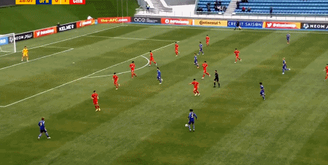 最终在比赛第12分钟,日本队在右路制造了空间,其实是我们的站位出现了问题,五后卫站得过于紧密,导致边路覆盖需要中场拉边,但这样一来,就出现了六后卫的危险: