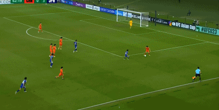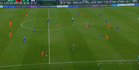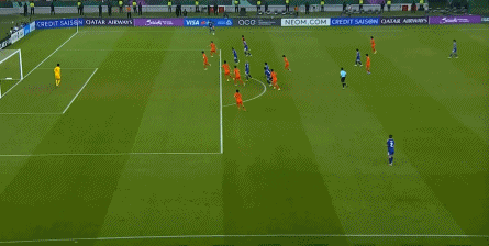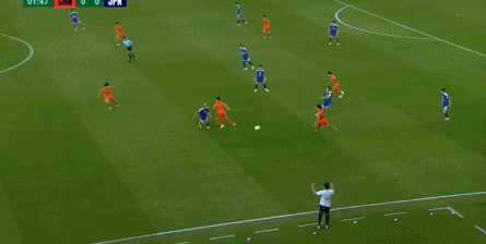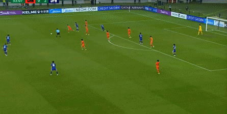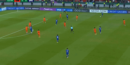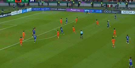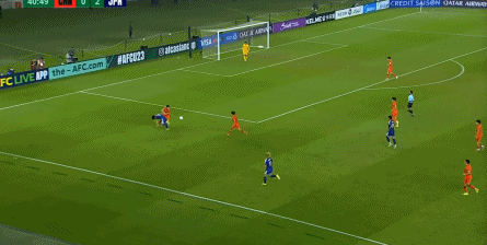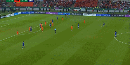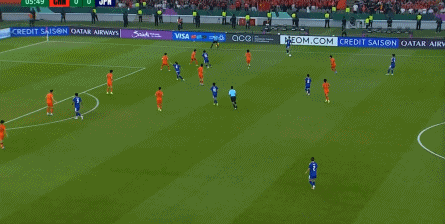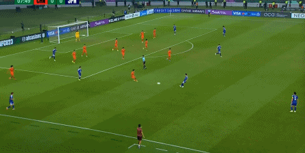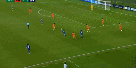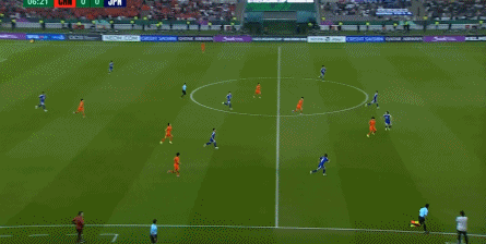 保持防守层次和覆盖外围空间的时候,就很容易出现问题了,于是日本队这次没有选择传后点,而是在倒三角方向的右肋取得进球: