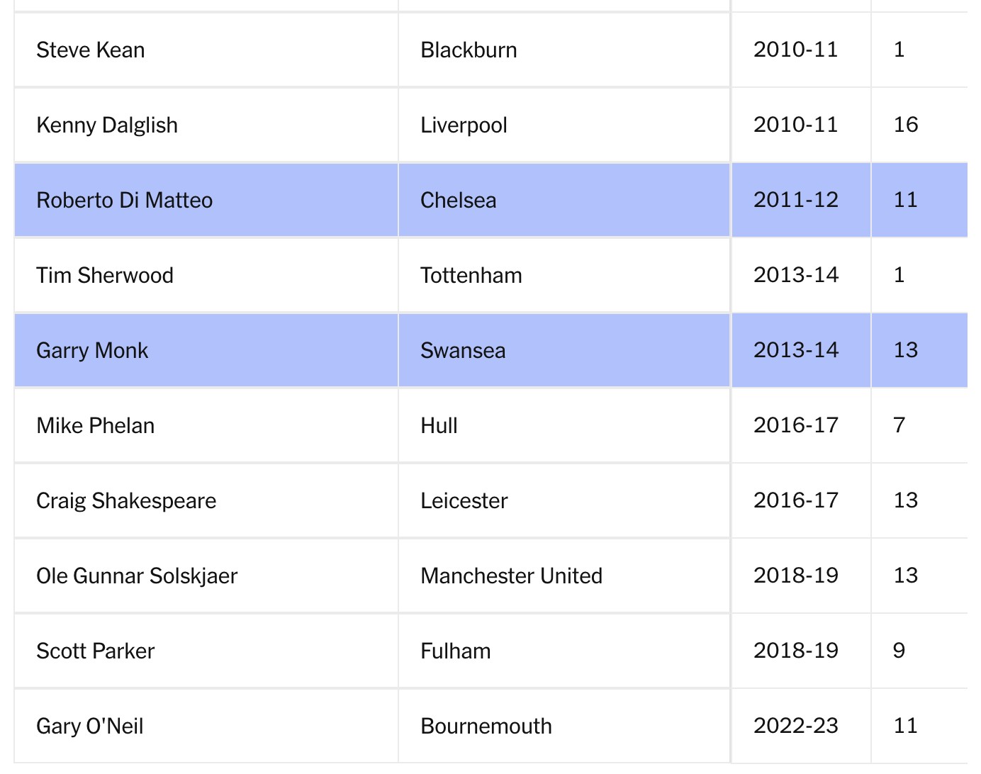 帕克或许可以算一个:他接手时球队降级几乎已成定局,但随后立刻率队完成升级。富勒姆的克里斯-科尔曼同样称得上成功,他在2003年至2007年间担任正式主帅,累计执教多达171场比赛。达格利什的实际战绩或许谈不上耀眼,但在霍奇森那段混乱而低迷的时期之后,利物浦上下几乎没人会后悔让他回归执教席。
