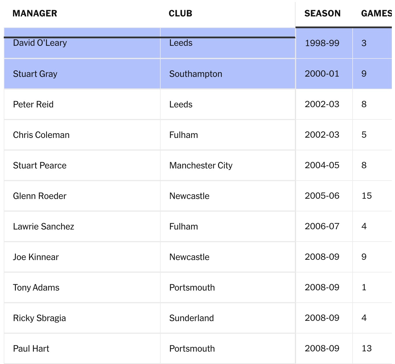 2000-01赛季南安普顿的斯图尔特-格雷是一个颇为奇特的案例。霍德尔在3月离任前往热刺执教后,助教格雷被任命为临时主帅。他在前7场比赛中只拿到2分,却在赛季最后两轮接连击败曼联和阿森纳。