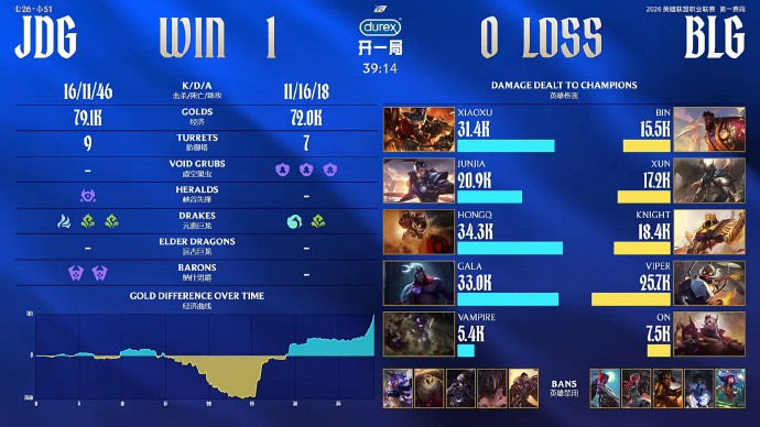 前期BLG上路越掉塞恩拿下一血,随后河道团战On锤石精准钩子又帮助BLG拿到优势,但随后BLG突然乱了阵脚,Viper厄斐琉斯被抓死,JDG拿到三条小龙。JDG龙魂团,巴德关键一大救到Gala厄斐琉斯,BLG虽然抢下小龙但是被打出一换四,JDG拿下大龙,29分钟下路一波结束比赛!