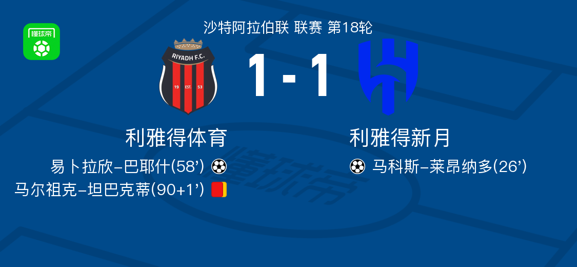北京时间1月26日,沙特阿拉伯联赛第18轮,利雅得体育主场对阵利雅得新月。马科斯-莱昂纳多破门得分,易卜拉欣-巴耶什随后破门扳平比分。比赛临近结束时,利雅得体育球员马尔祖克-坦巴克蒂累计两张黄牌被罚离场。最终双方1比1战平。