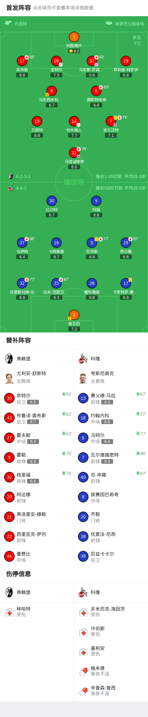 第44分钟,弗赖堡球员金特尔助攻马塔诺维奇打入一球。