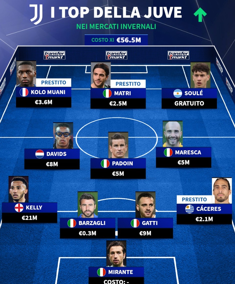 北京时间1月26日,德转评出了尤文图斯队史冬窗成功引援的11人阵容,巴尔扎利、埃德加-戴维斯、马雷斯卡在列,劳埃德-凯利、费代里科-加蒂、马蒂亚斯-苏莱以及科洛-穆阿尼上榜。