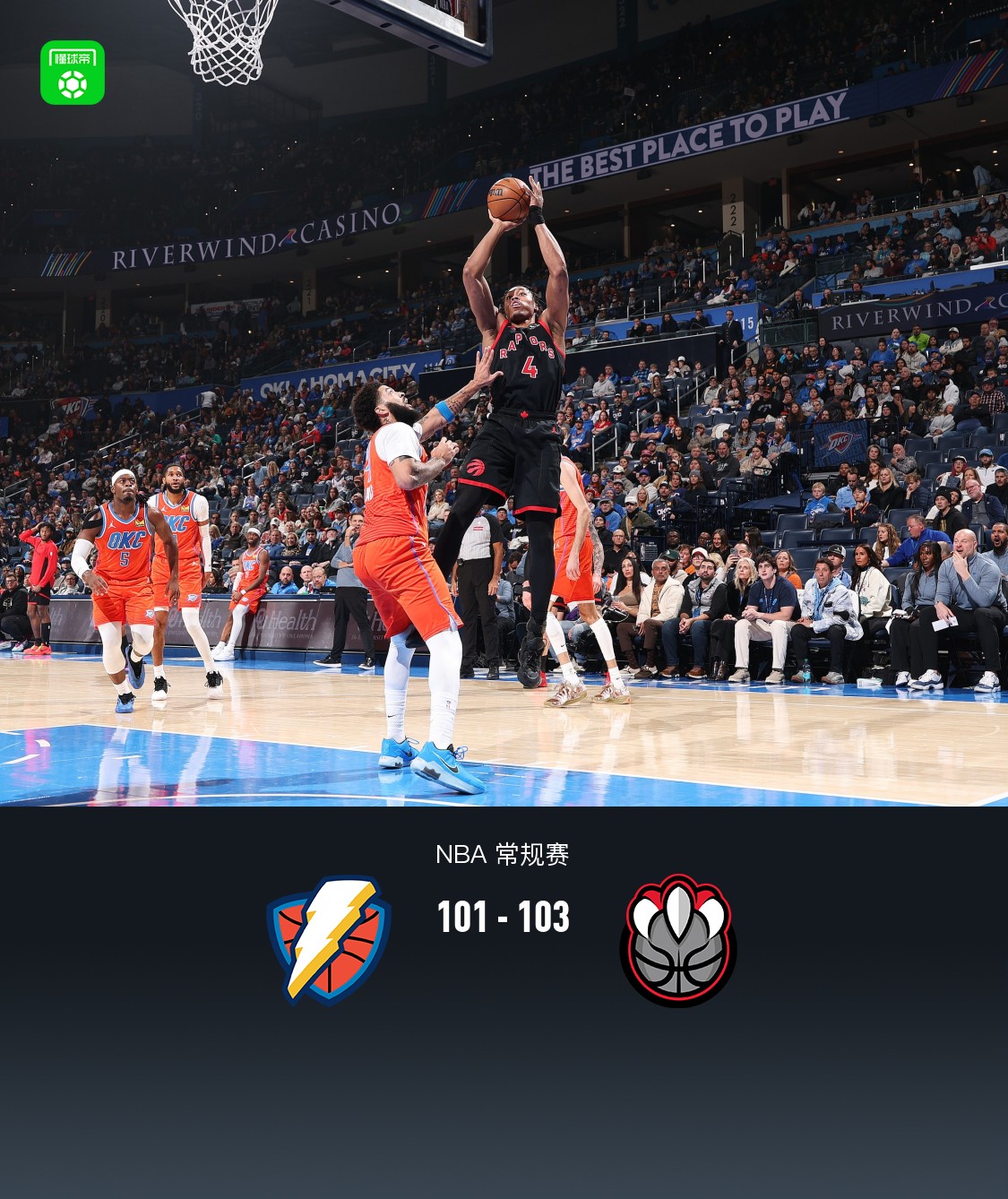 第四节雷霆肯里奇-威廉姆斯拿下7分,猛龙奎克利拿下11分,最终雷霆101-103不敌猛龙