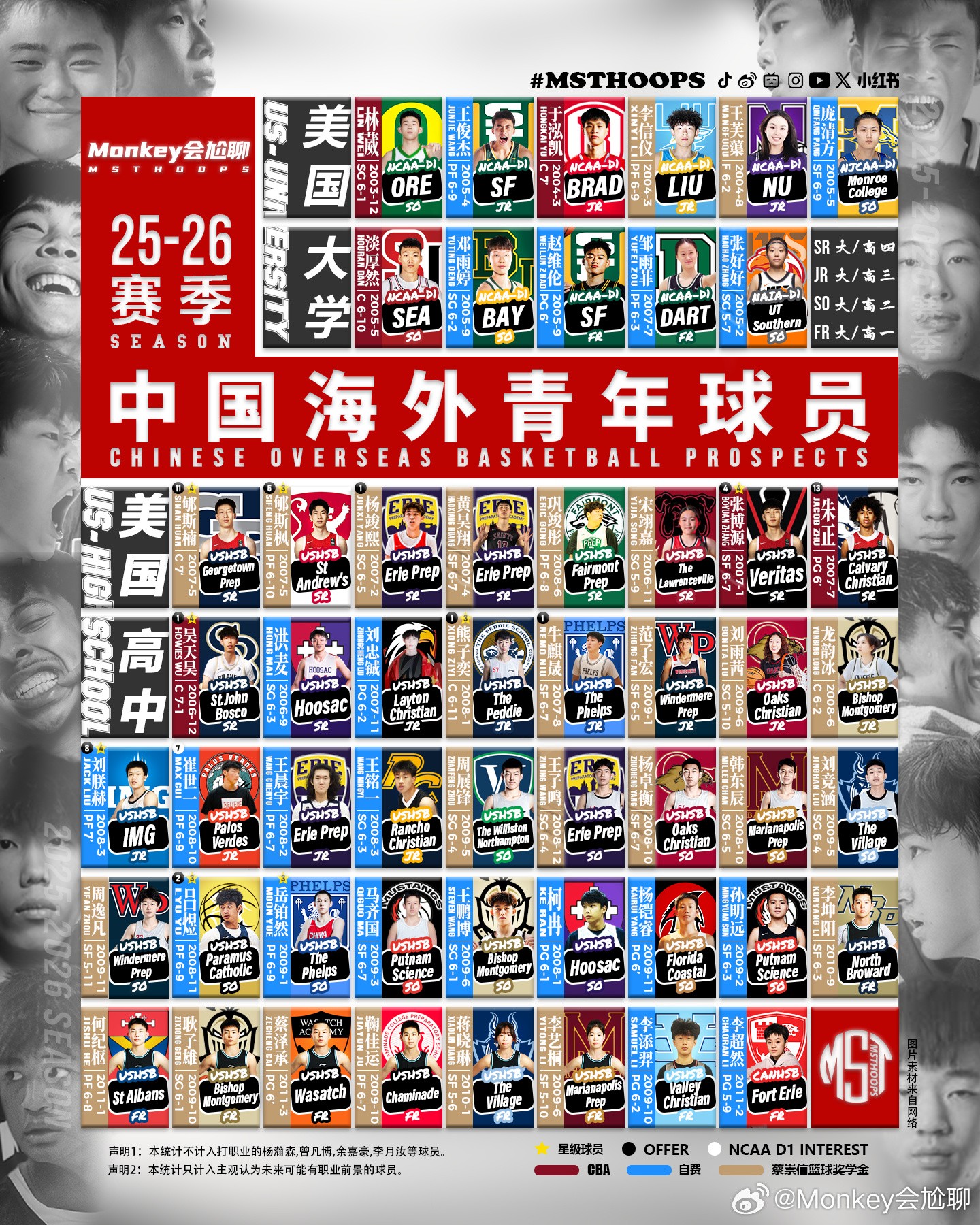 中国足球的留洋样本少,通过事实去对比“留在中超”和“海外留洋”的区别很难,但同处低谷的中国篮球已经为中国篮球打好了样。根据博主“Monkey会尬聊”的统计,25-26赛季共有53名中国籍球员效力于美国高中联赛和大学联赛(仅统计有职业前景的球员),其中多名球员获得星级评定。