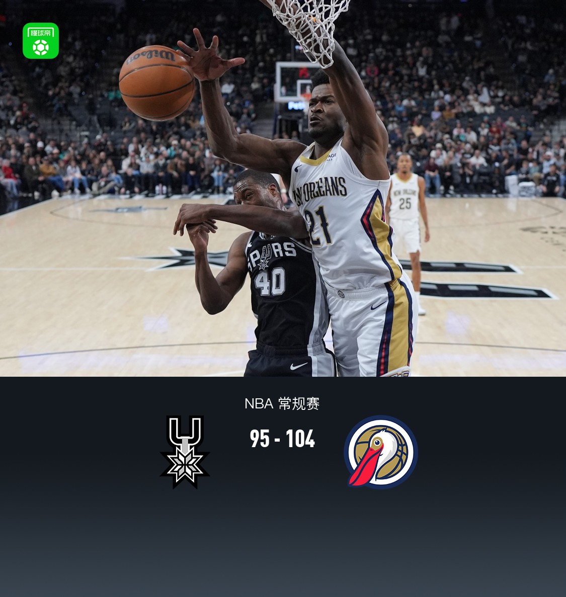 第四节马刺文班亚马拿下6分,鹈鹕锡安-威廉森拿下6分,最终马刺95-104不敌鹈鹕