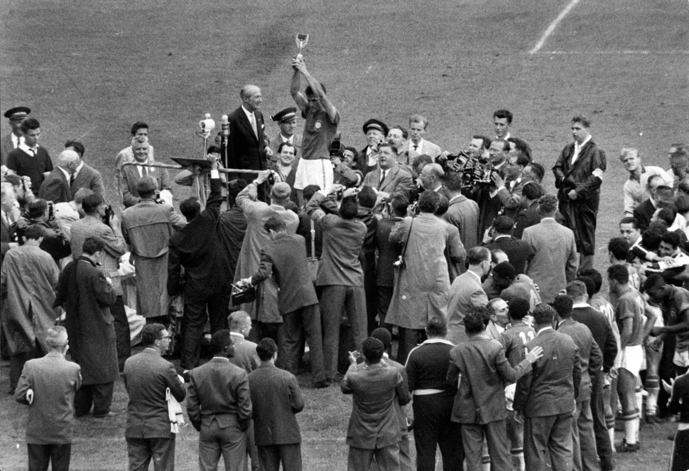 胜利让贝利热泪盈眶。球队的老大哥们把这个最年轻的小老弟高高举起,让他接受所有人的欢呼和致敬。守门员吉尔马对贝利说:“哭吧,孩子!哭出来对你有好处。”