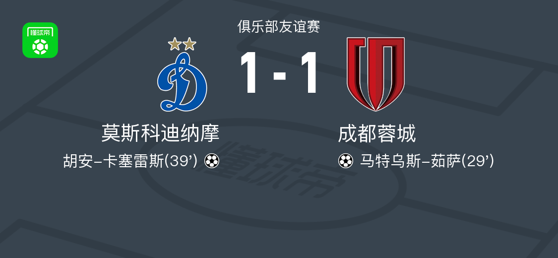 北京时间1月26日,俱乐部友谊赛莫斯科迪纳摩对阵成都蓉城。马特乌斯-茹萨率先破门,随后胡安-卡塞雷斯扳平比分。最终双方以1比1结束比赛。