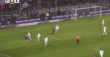第90+3分钟,劳姆送点,卡尔斯主罚点球命中,圣保利1-1莱比锡