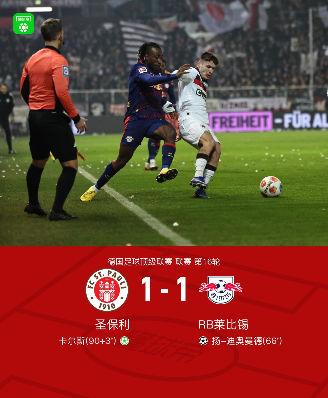 北京时间1月28日,德国足球甲级联赛第16轮,圣保利主场迎战RB莱比锡。扬-迪奥曼德破门为RB莱比锡取得领先;补时阶段,卡尔斯主罚点球命中,帮助圣保利扳平比分。最终双方1比1战平。