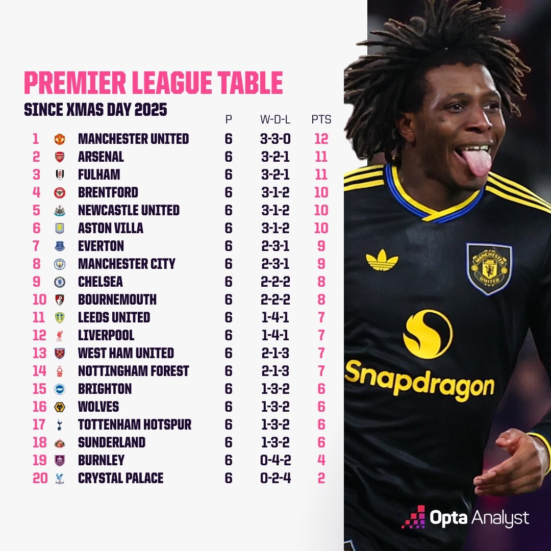 据足球数据网站Opta统计,自圣诞节以来没有任何英超球队的胜率超过50%,曼联拿到12分,是同期拿分最多的球队。