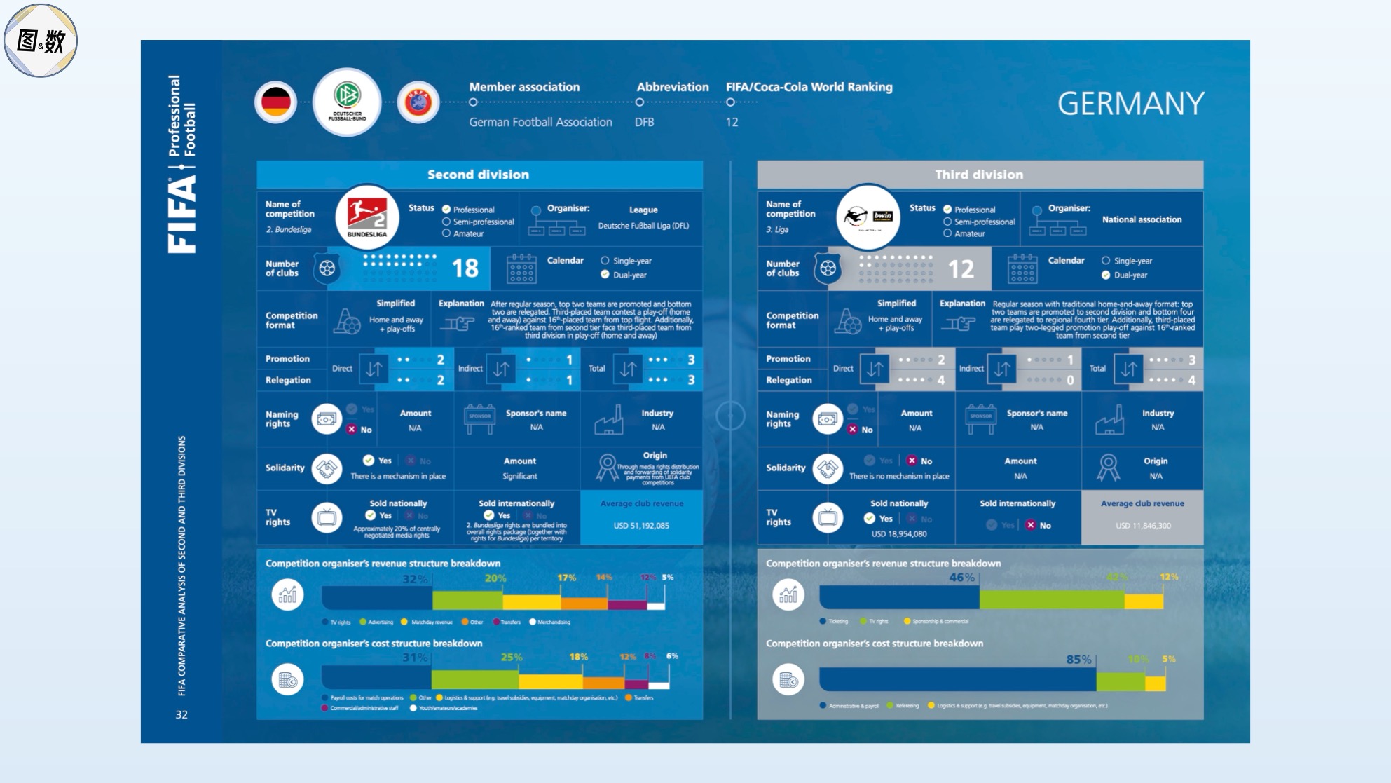 国际足联在2020-2021年研究了男子足球代表队世界排名前25的国家及地区的次级和第三级足球联赛,发现德乙是全球队均营收最高的次级联赛,而德丙是全球队均营收最高的第三级联赛(队均营收1184.6万美元)。
