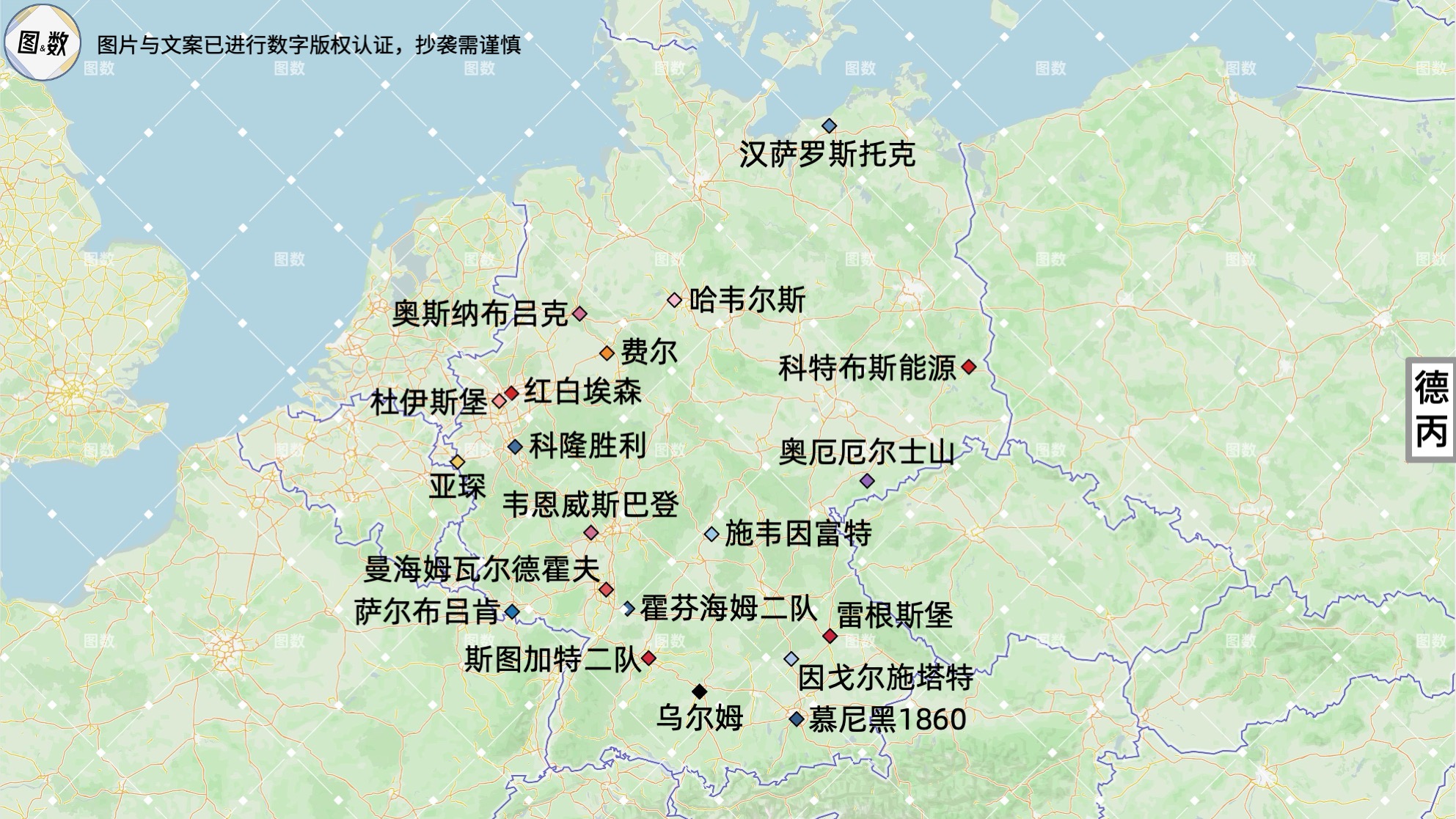 德丙2025-26赛季的20队来自九个联邦州:北莱茵-威斯特法伦州的球队是亚琛、杜伊斯堡、红白埃森、费尔和科隆胜利,共5队,占全国的四分之一;巴登-符腾堡州的球队是乌尔姆、曼海姆瓦尔德霍夫、霍芬海姆二队和斯图加特二队,共4队,占全国的五分之一;巴伐利亚州的球队是慕尼黑1860、雷根斯堡、因戈尔施塔特和施韦因富特,共4队,占全国的五分之一;下萨克森州的2队是奥斯纳布吕克和哈韦尔斯;黑森州的球队是韦恩威斯巴登;萨尔州的球队是萨尔布吕肯;来自原东德地区的3队是勃兰登堡州的科特布斯能源,萨克森州的厄尔士山奥厄,以及梅克伦堡-前波莫瑞州的汉萨罗斯托克。